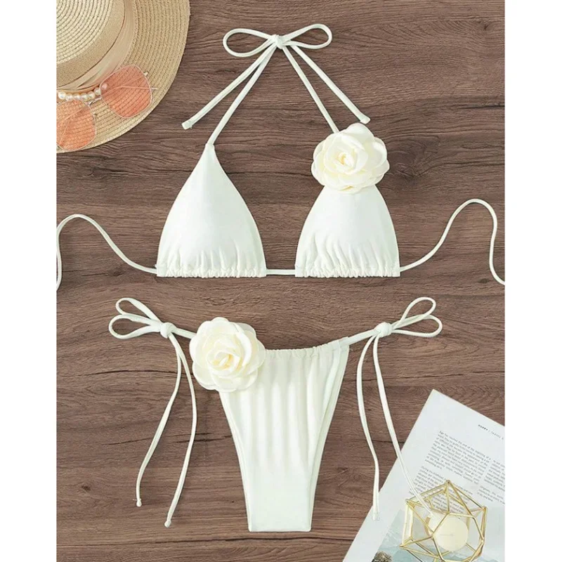 Summer Women Solid Color Swimsuit Sexy Flower Backless Pure Cotton Swimsuit Fashion Suspender Split Style Bikini Set