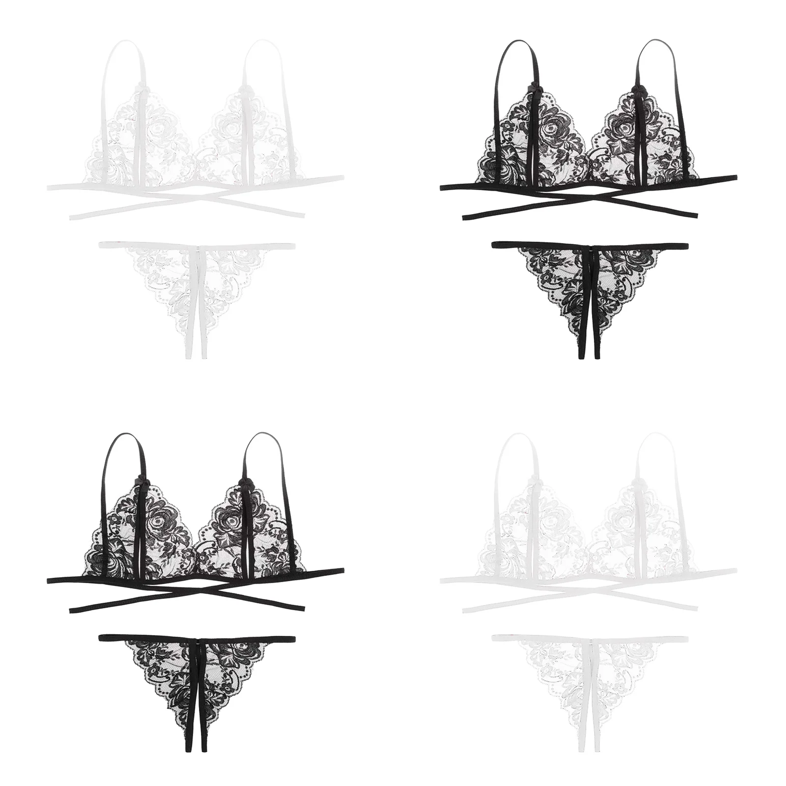 2 Pcs Women Lingerie Sets Full Lace Embroidery Bra Suit Bandage Bralettes Open Crotch Micro Thong Ultra Thin Brassiere G-String