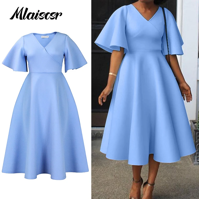Mlaiscsr Women's Elegant Office Blue Mid Dress V-Neck Ruffle Sleeve High-Waisted Pleated A-Line Birthday Dinner African Vestidos