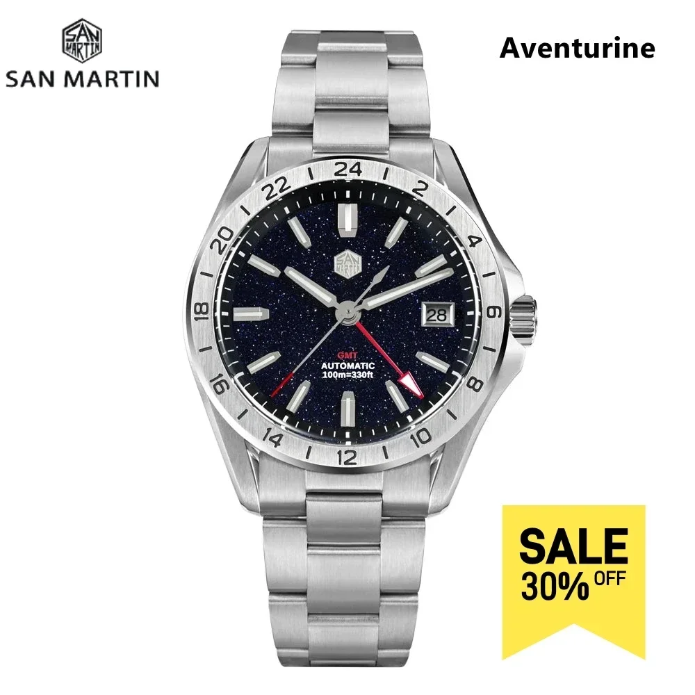 San Martin 39mm Aventurine Gemstone Dial Luxury Men's Watch NH34 GMT Automatic Mechanical Sapphire Waterproof Luminous SN0129GB