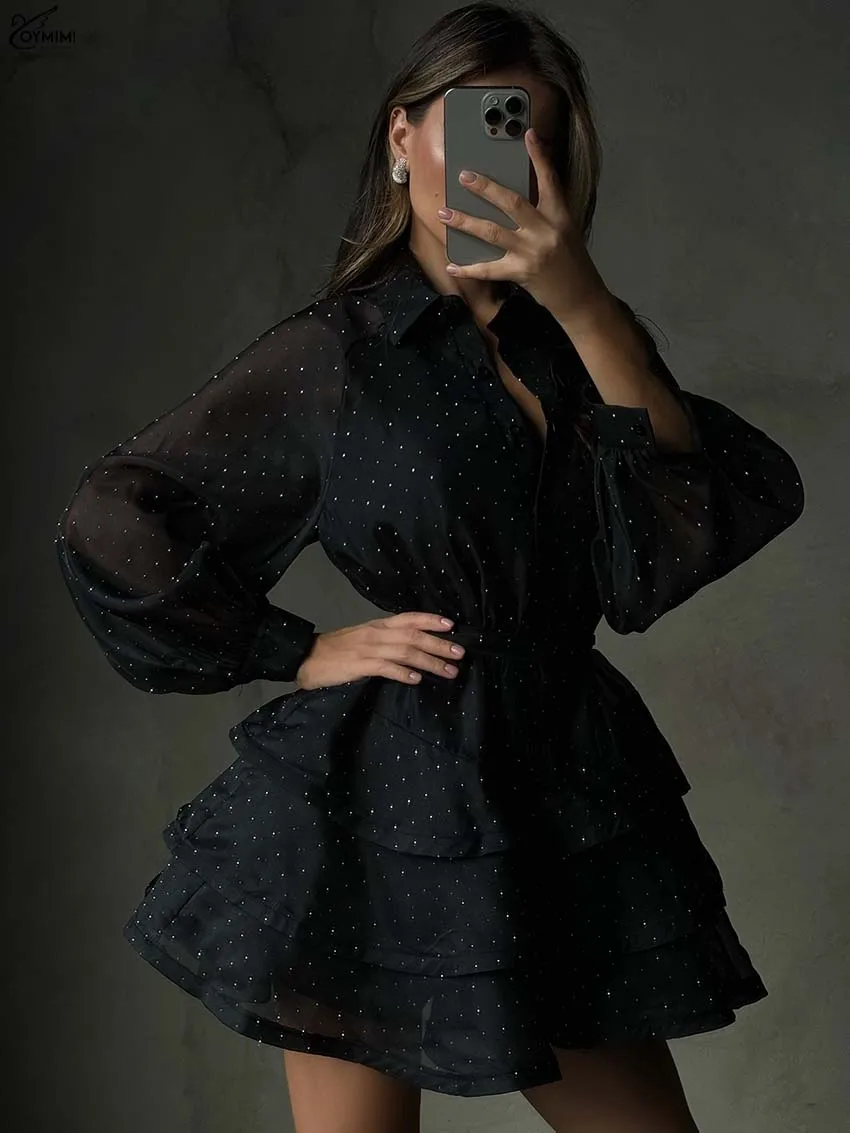 Oymimi Fashion Black Rhinestone Women's Dress Casual Lapel Long Sleeve Button Dresses Elegant New Lace-Up Pleated Mini Dresses