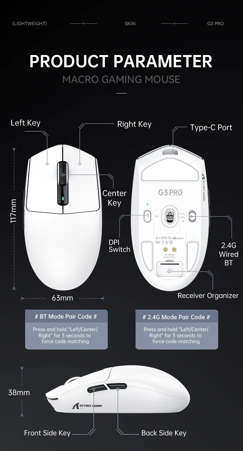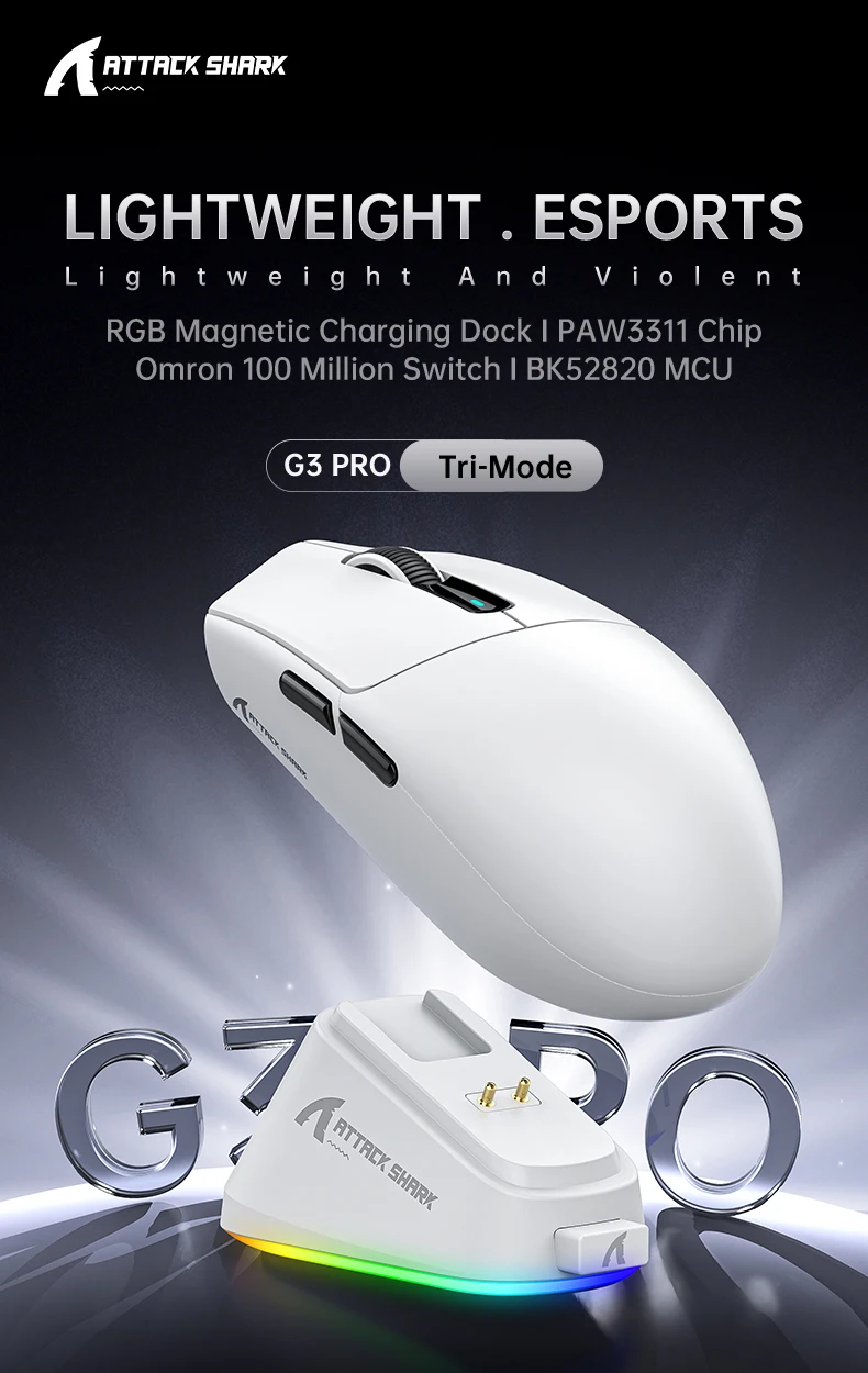 ATTACK SHARK G3 PRO Lightweight Gaming Mouse RGB Magnetic Dock | 62g Ultra Light | PAW3311 Sensor | OMRON 100M Clicks | Tri-Mode 2.4G/BT/Wired | Black/White