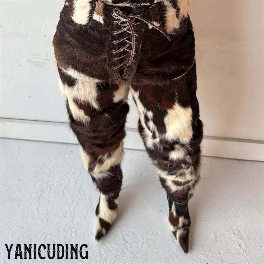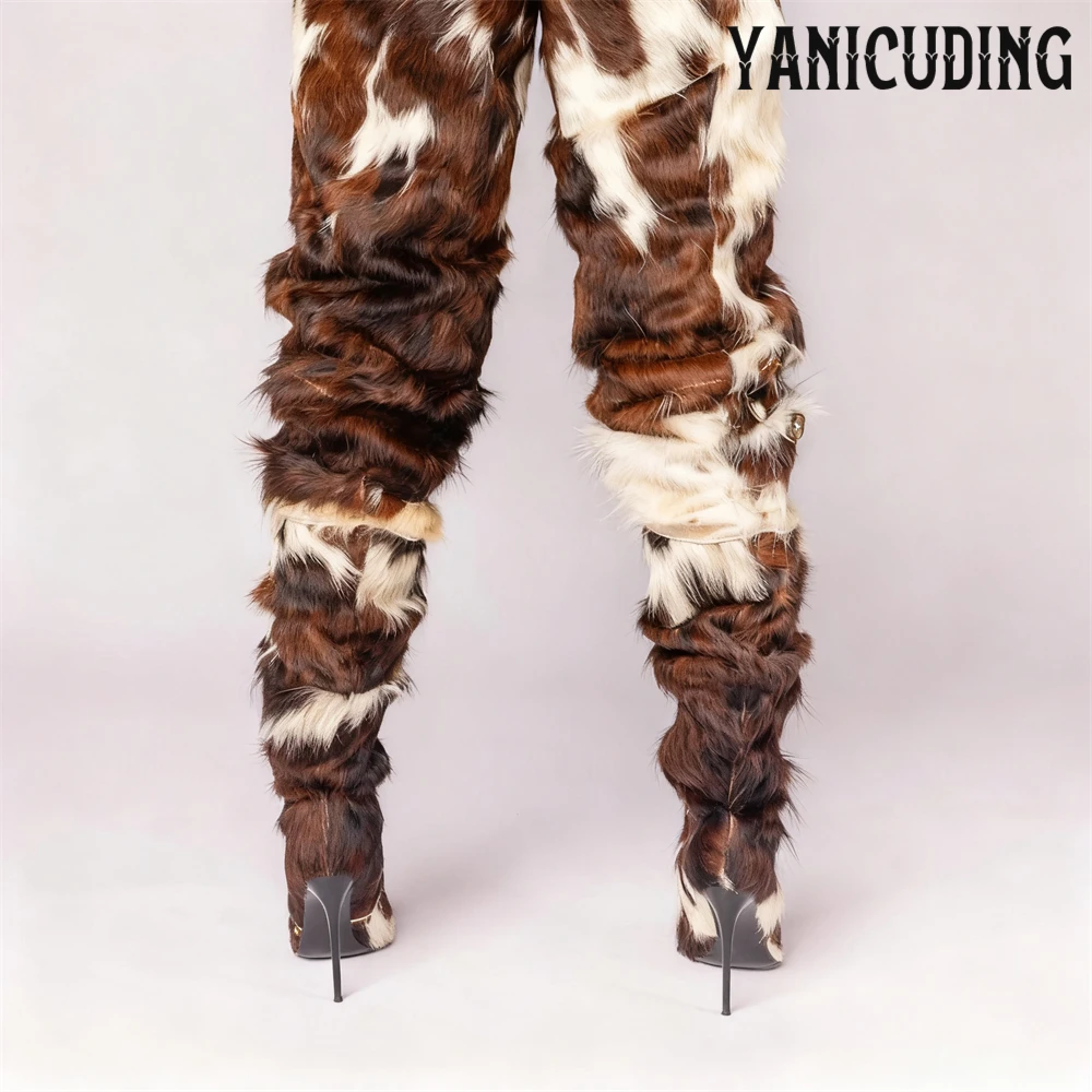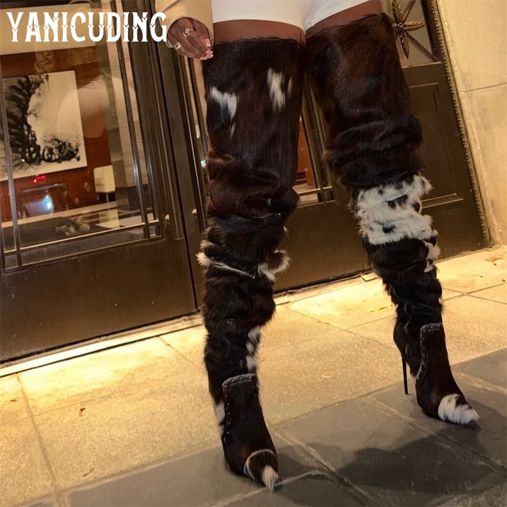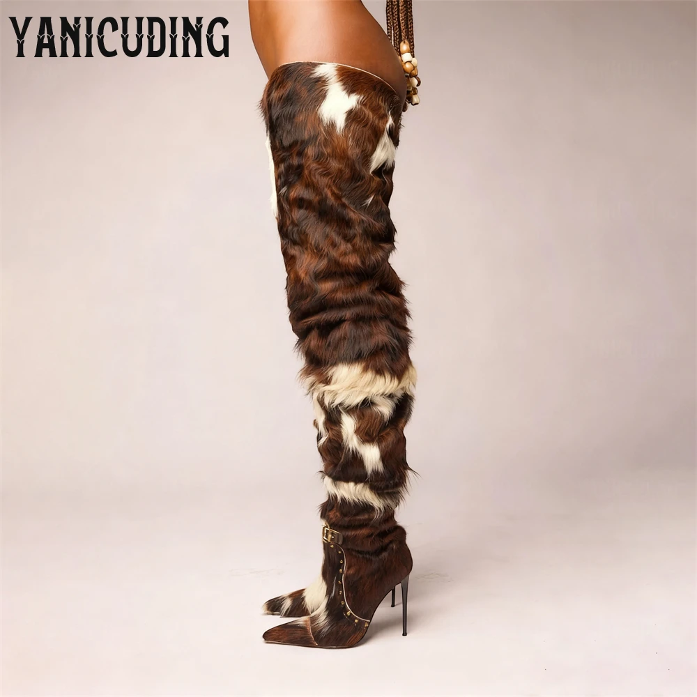 Cowhide Furry Thigh High Boot Fashionable Black Rivet over the Knee Boots Designer Style Pointed Toe Stiletto Boots for Women