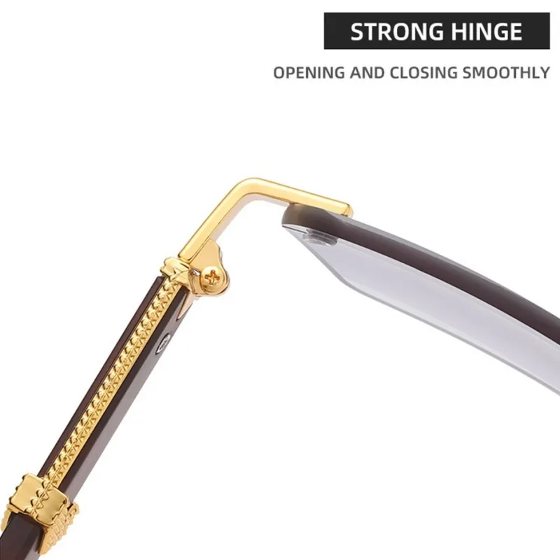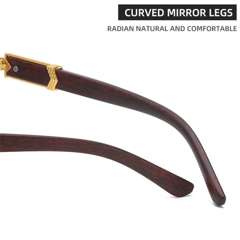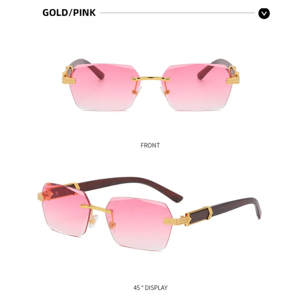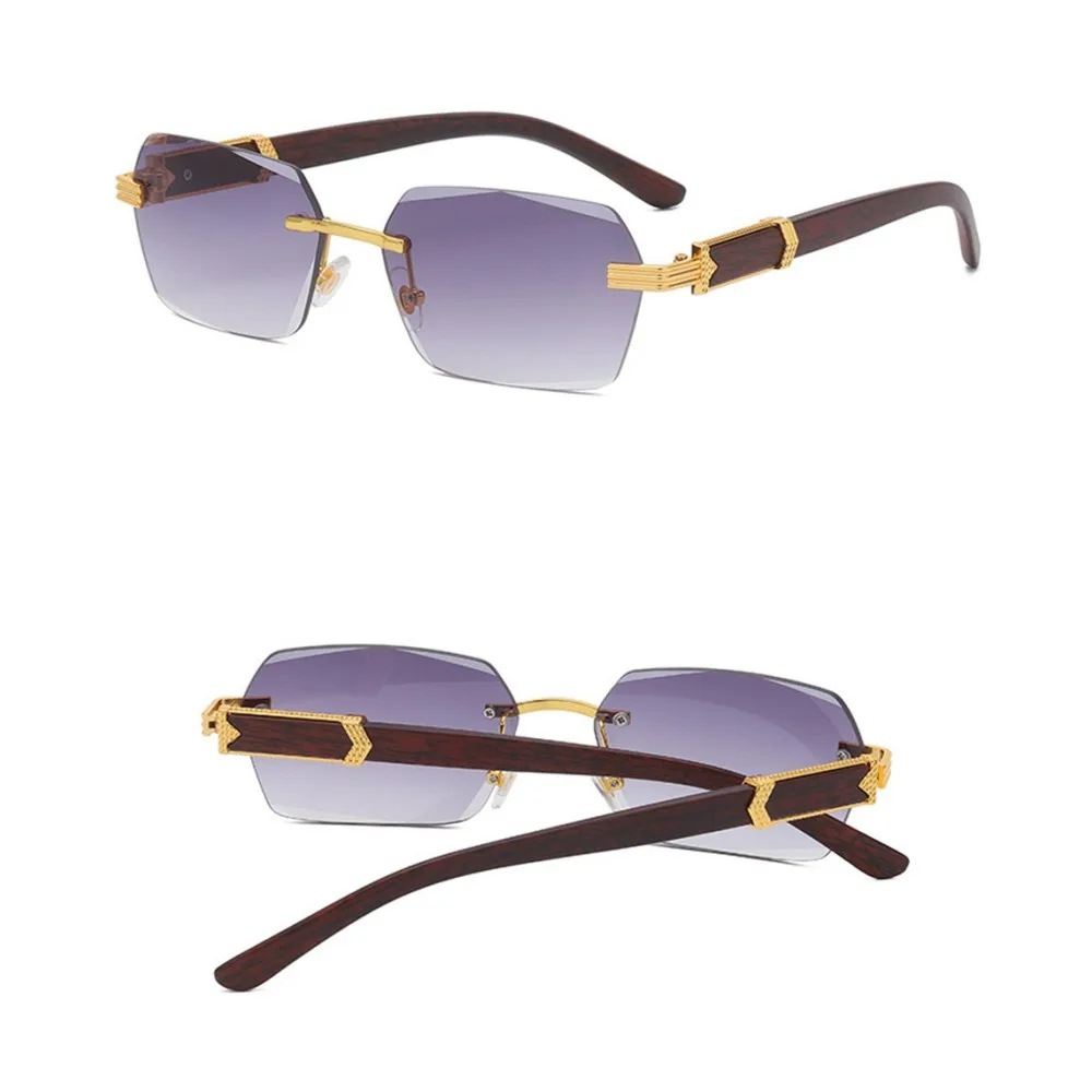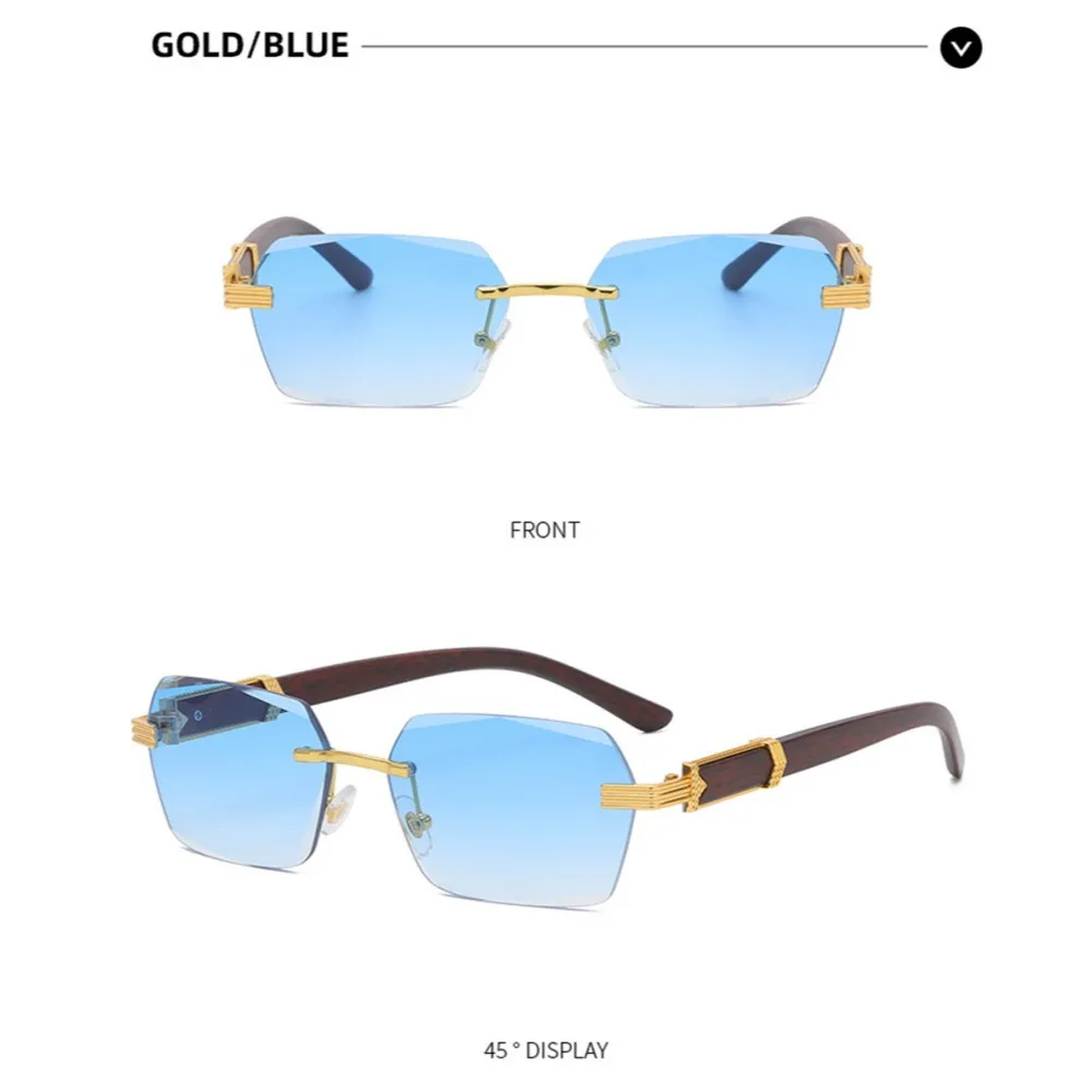 KLASSNUM Men Luxury Rimless Sunglasses Rectangle Anti UV400 Color Lens with Wooden Grain Leg Unisex Women Retro Shades