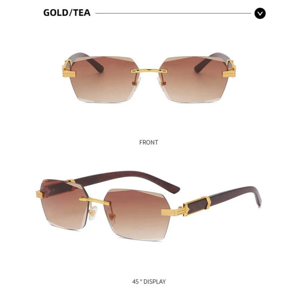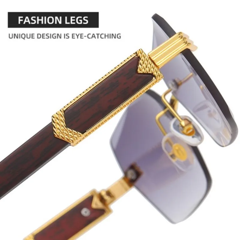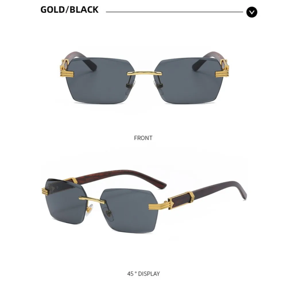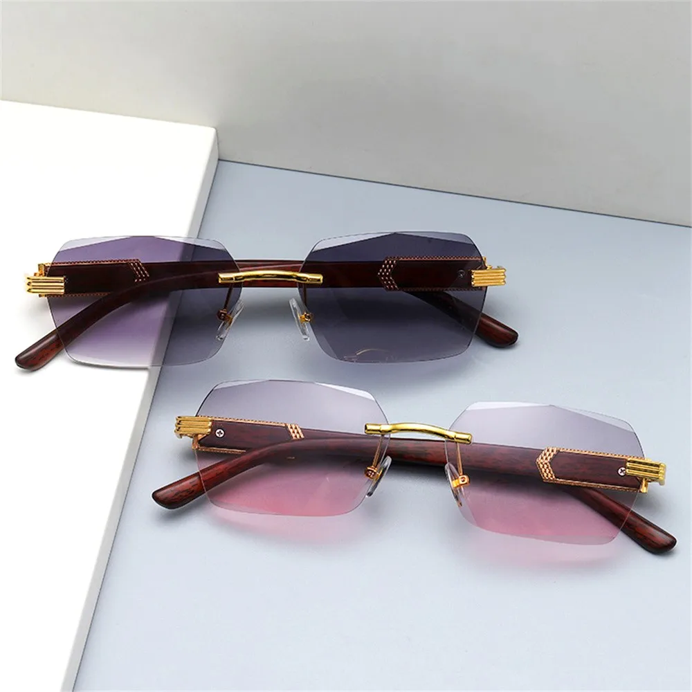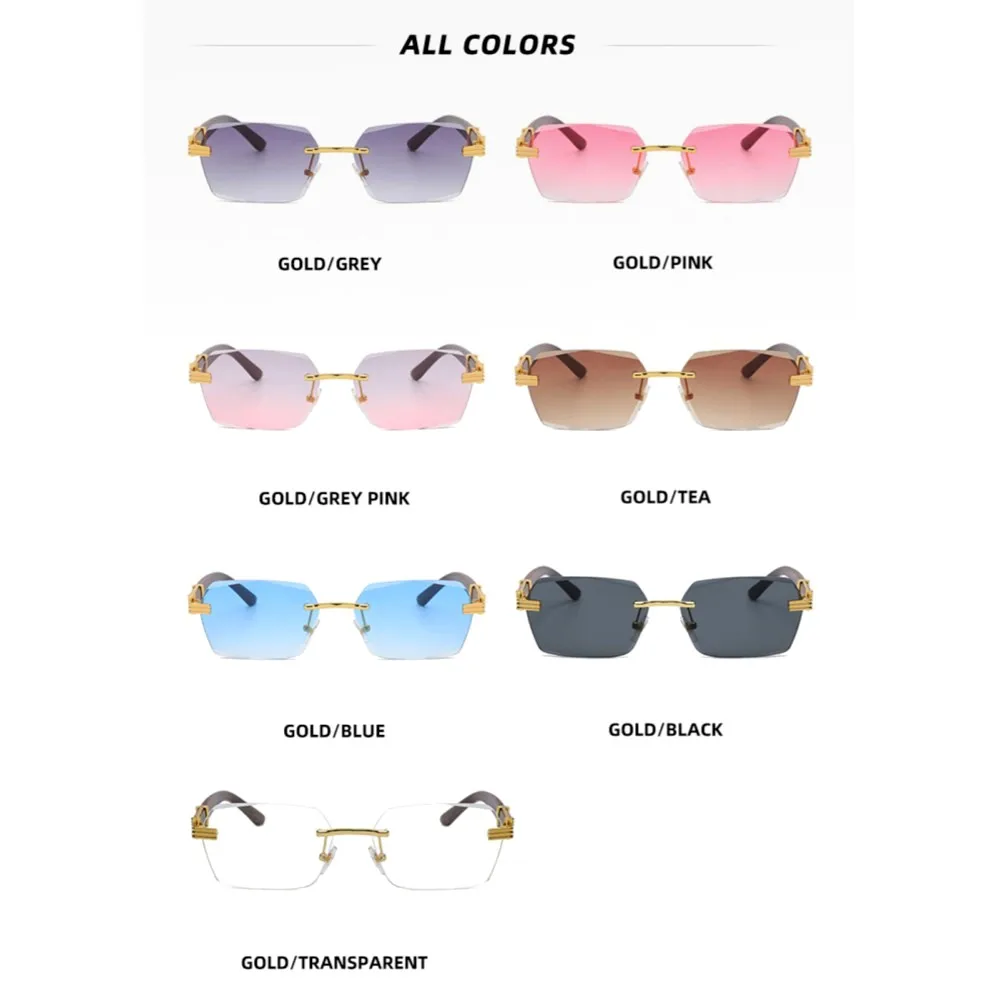 KLASSNUM Men Luxury Rimless Sunglasses Rectangle Anti UV400 Color Lens with Wooden Grain Leg Unisex Women Retro Shades 2024 New