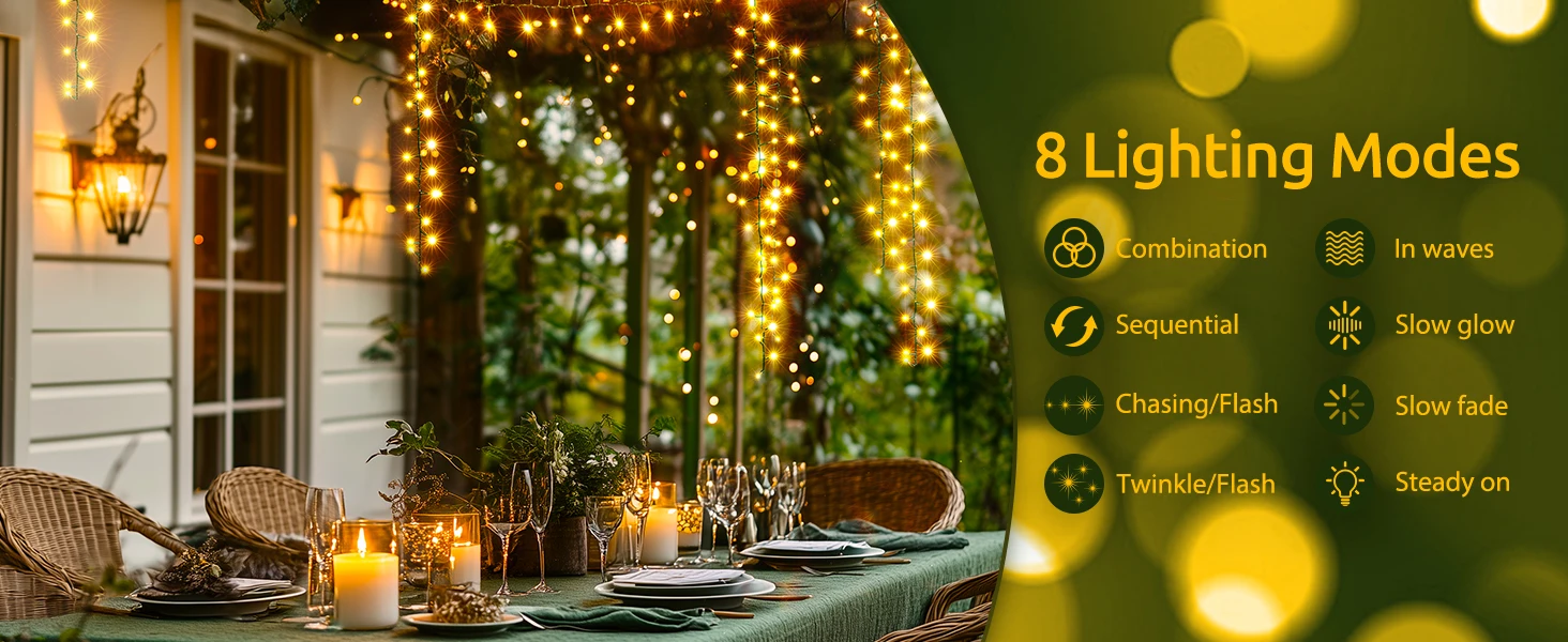 【8 Light Modes】 1.Combination, 2.in waves, 3.sequential, 4.slow glow, 5.chasing/flash, 6.slow fade, 7.twinkle/flash, 8.steady-on.