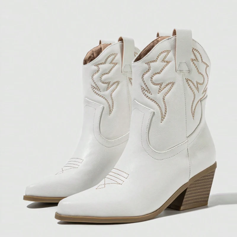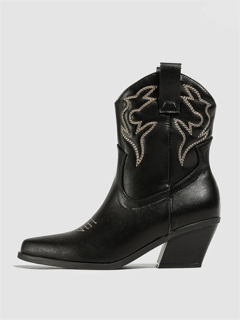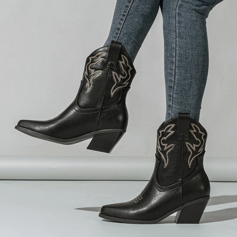 Liyke Western Style Cowboy Ankle Boots For Women Embroidery Leather Pointed Toe Autumn Winter Low Thick Heels Shoes Black Brown