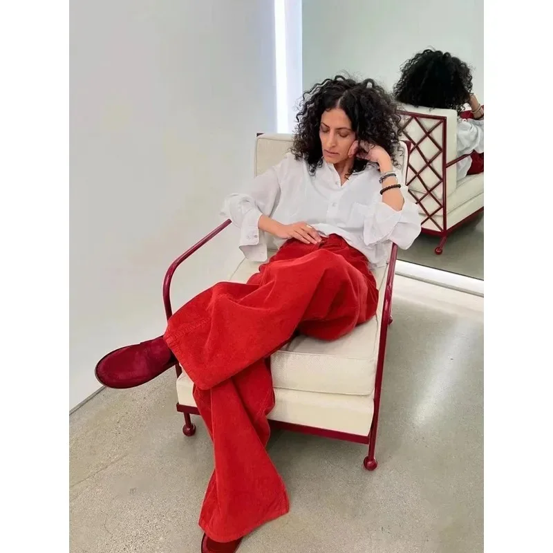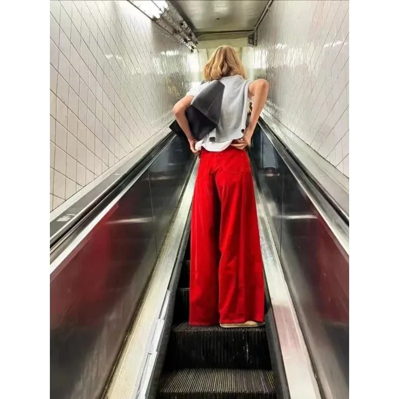 LUXURY Red Corduroy Wide Leg Pants for Women, Floor Length Casual Pants, Loose and Slimming, Minimalist, 2024 Autumn and Winter