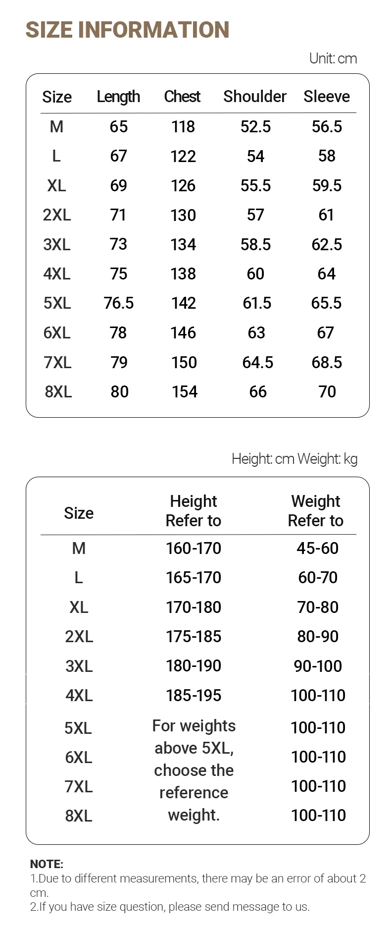 M, L, XL, XXL, XXXL, 4XL, 5XL, 6XL, 7XL, 8XL