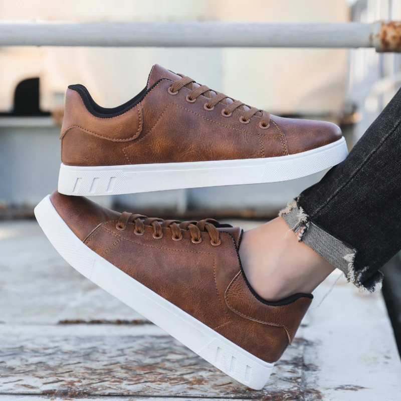 Men Sports Shoe Brown Pu Leather Men Vulcanized Shoes Fashion Versatile Solid Color Running Shoes for Men Plus Size 48 Sneakers