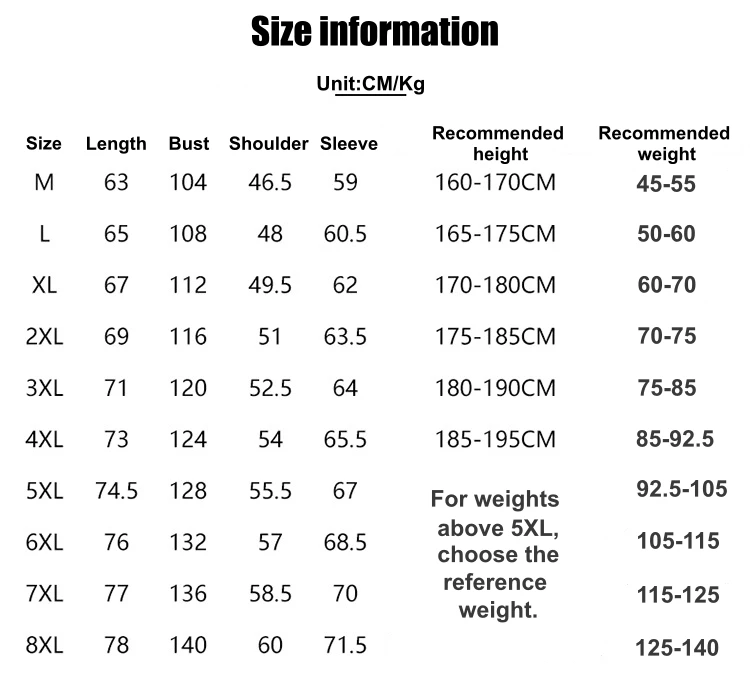 M, L, XL, XXL, XXXL, 4XL, 5XL, 6XL, 7XL, 8XL