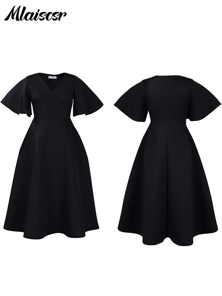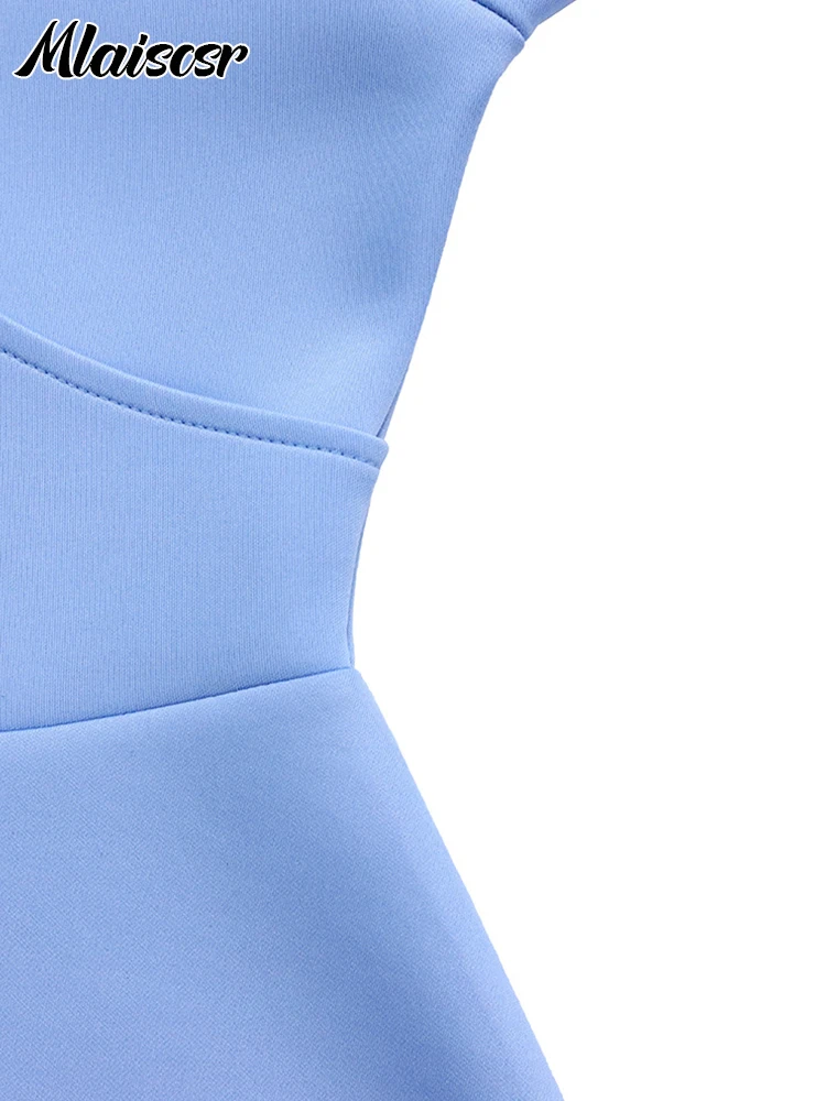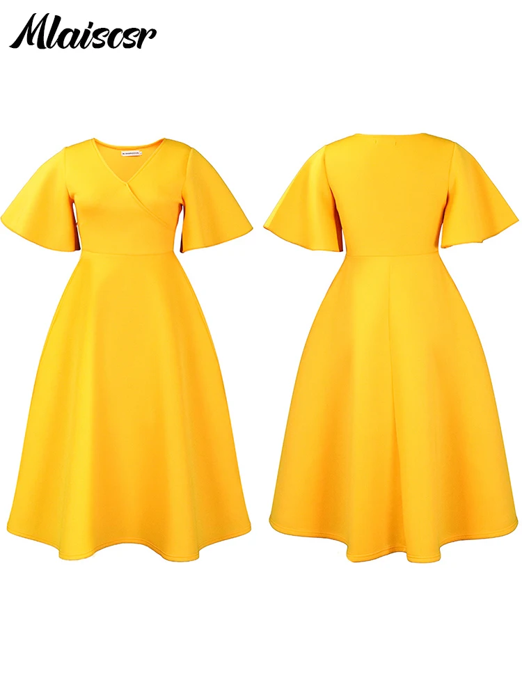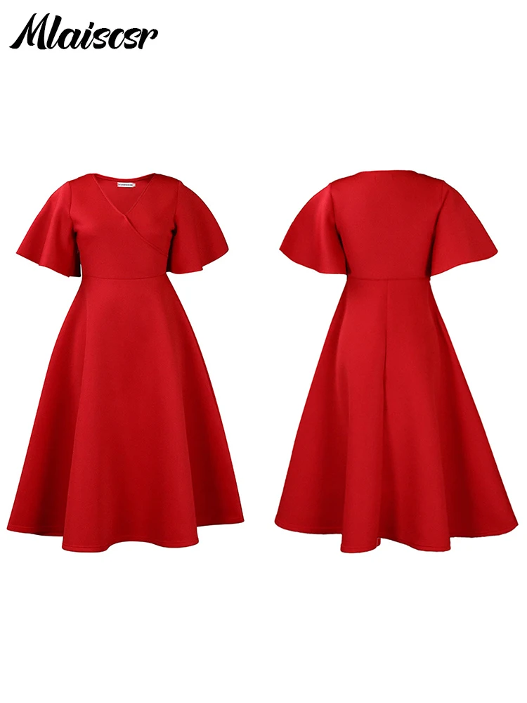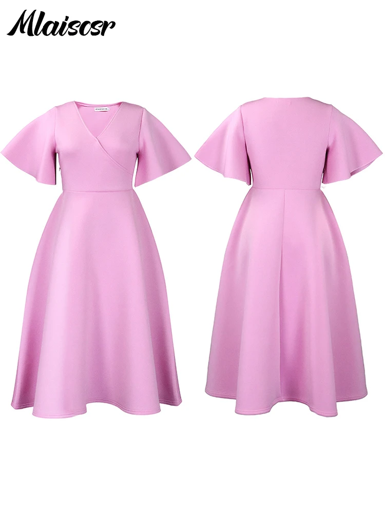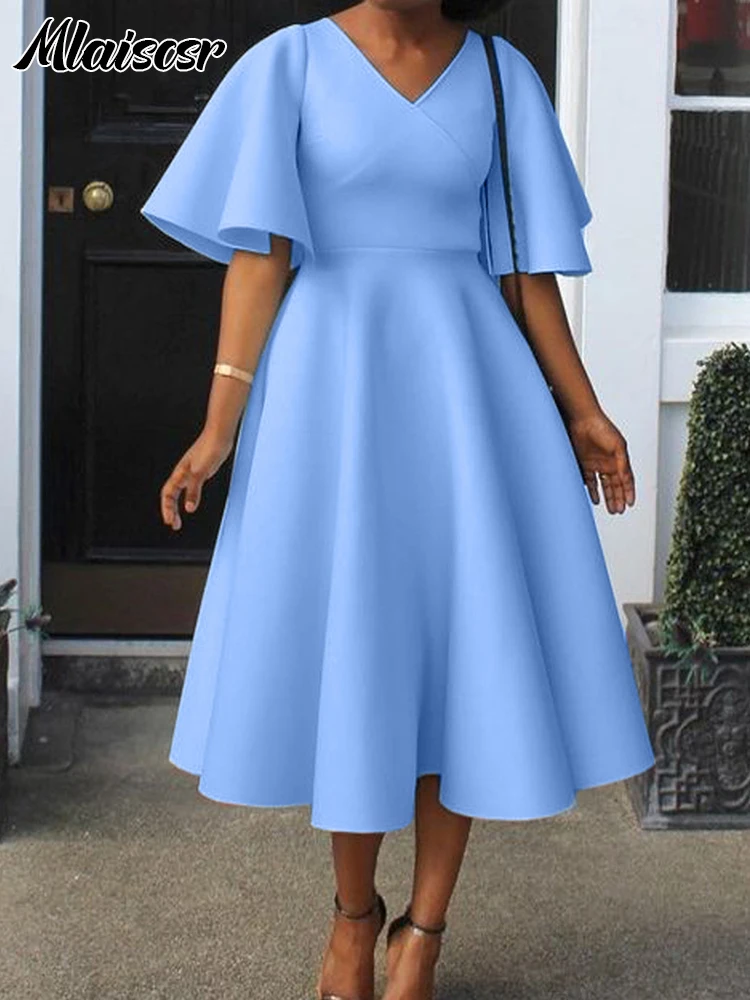 Mlaiscsr Women's Elegant Office Blue Mid Dress V-Neck Ruffle Sleeve High-Waisted Pleated A-Line Birthday Dinner African Vestidos