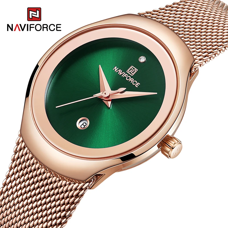 NAVIFORCE Luxury Green Analog Date Quartz Fashion Ladies Watches Mesh Steel Strap Waterproof Business Women Wristwatch Clocks