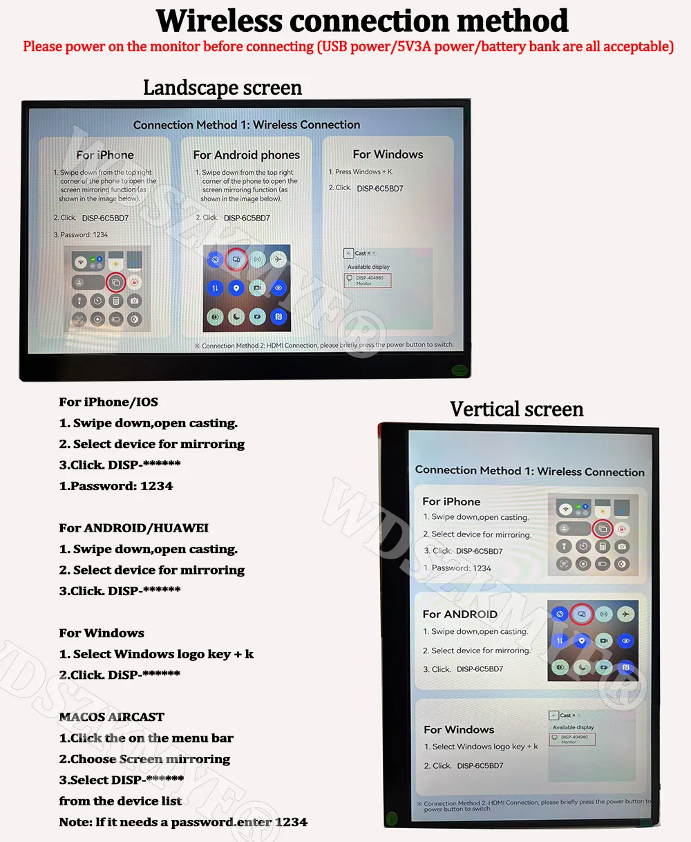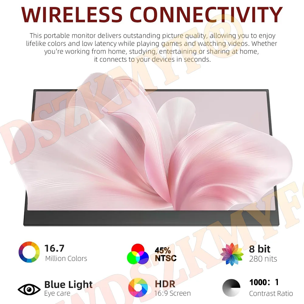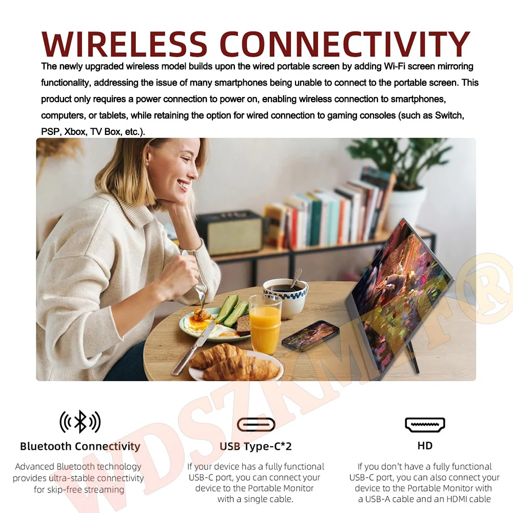 3.Plug and Play Monitor: wireless portable laptop monitor powers up and is ready to expand and mirror your device via Wi-Fi, connecting to devices without cables. Once switched on, the monitor shows three different wireless connections, which can be used in conjunction with the Manual to bring you a wireless, simple work and life experience.