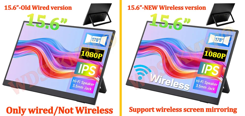 2.1080P Wireless Portable Monitor Built-in Stand: Featuring a 1080P resolution, 60 HZ, 100% color gamut, 178° FULL viewing angle, HDR, and Low Blue Light Ultra Clear A-grade IPS-ADS screen, this 15.6 inch wireless portable screen for laptop has a built-in stable stand with adjustable angle for landscape and vertical mode for high productivity. NOTE: The monitor also comes with two VESA holes and supports VESA Mounting Compliant.
