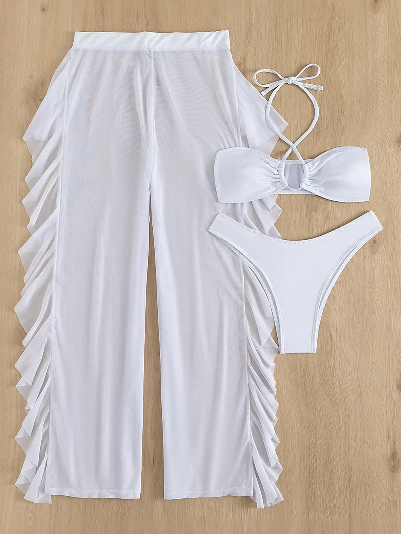 Plain Criss Cross Halter Bikini Set With Ruffle Pants Bandeau Swimsuit Women 2024 White Swimwear Female Bathing Suit Black