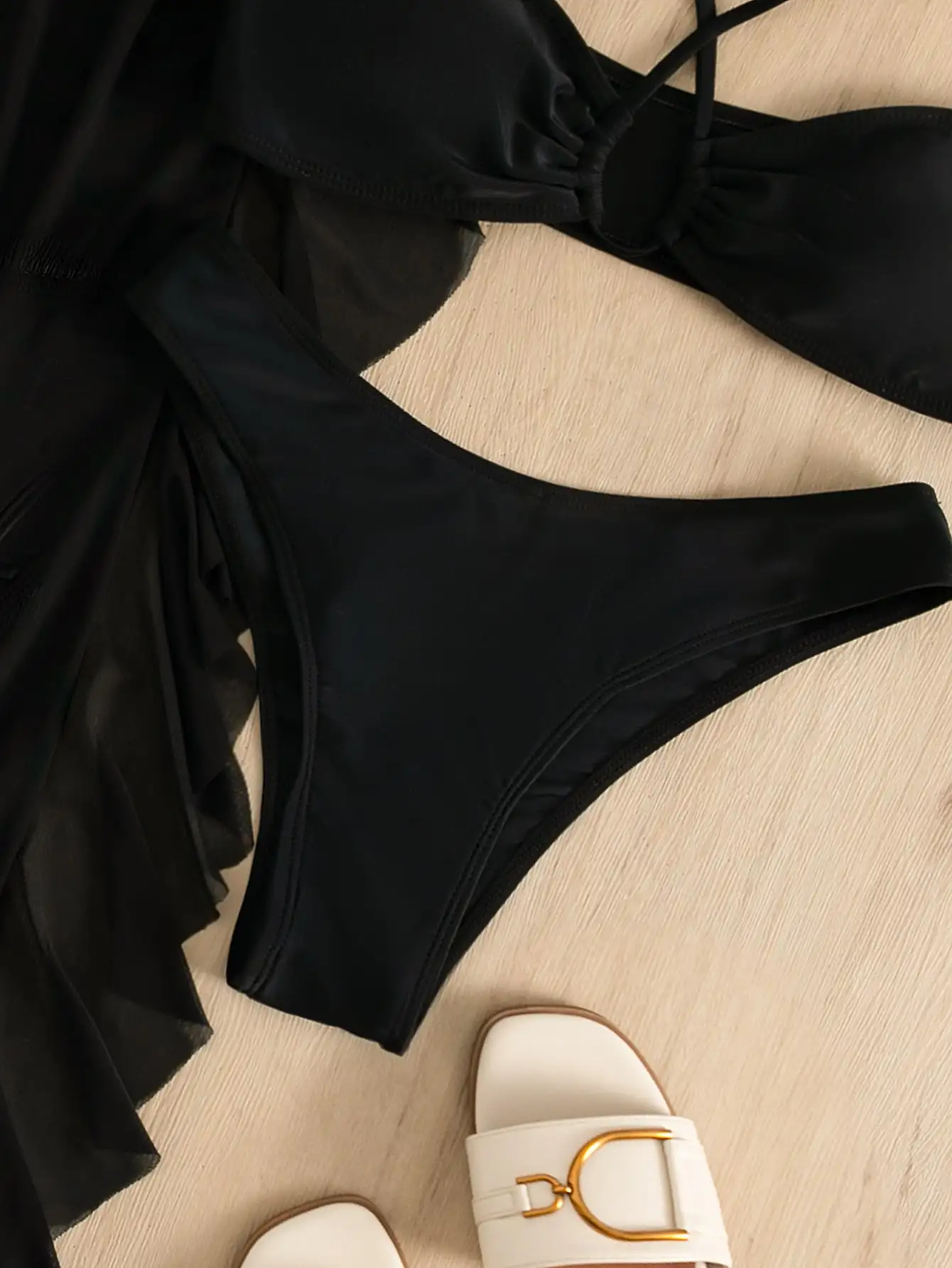 Be the first to review “Plain Criss Cross Halter Bikini Set With Ruffle Pants Bandeau Swimsuit Women 2024 White Swimwear Female Bathing Suit Black”