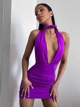 Ahagaga Sexy Club Solid Mini Dresses Fashion Streetwear Halter Backless Casual Deep V-neck Slim Skinny Women Vestidos Ruched