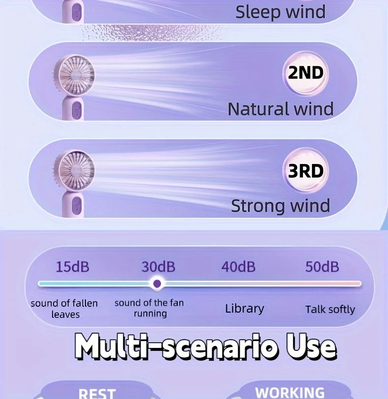 3. Rechargeable Battery:Powered by an upgraded rechargeable battery, this handheld fan can be charged using a wall charger, power bank, or computer via USB cable. After being fully charged, the battery can last up to 2.5 hours.