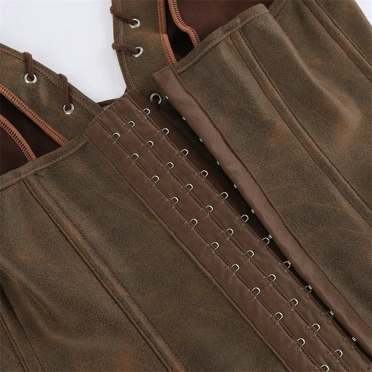 Retro Brown Women's Corset Bustier Hollowed-Out Lace-Up Sleeveless Halter Top Overbust Corselet