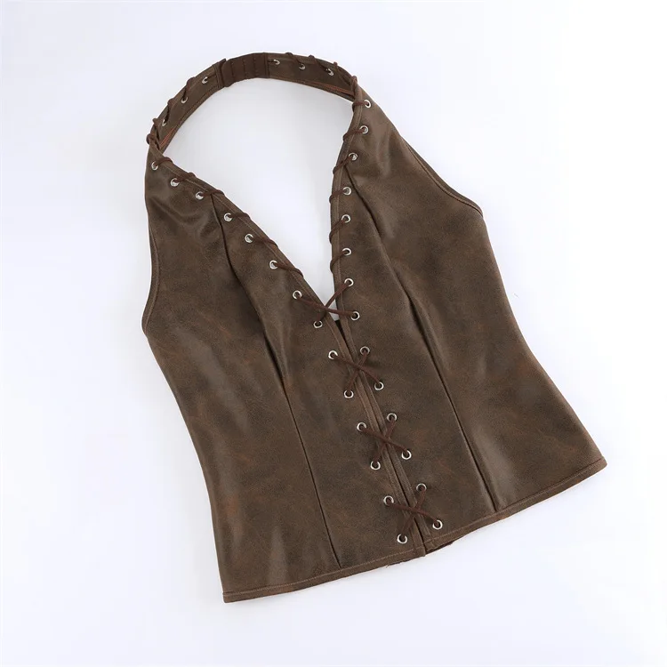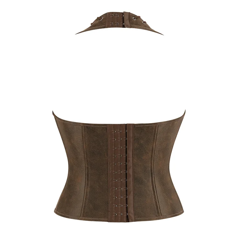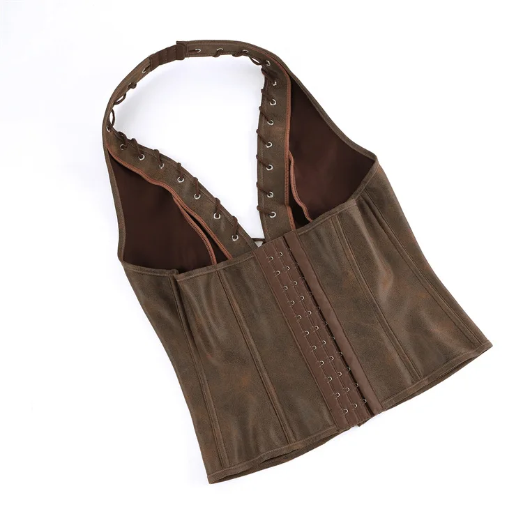 Retro Brown Women’s Corset Bustier Hollowed-Out Lace-Up Sleeveless Halter Top Overbust Corselet