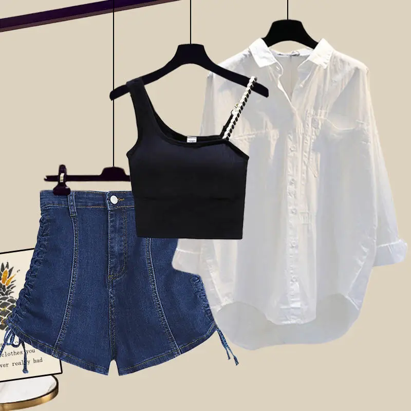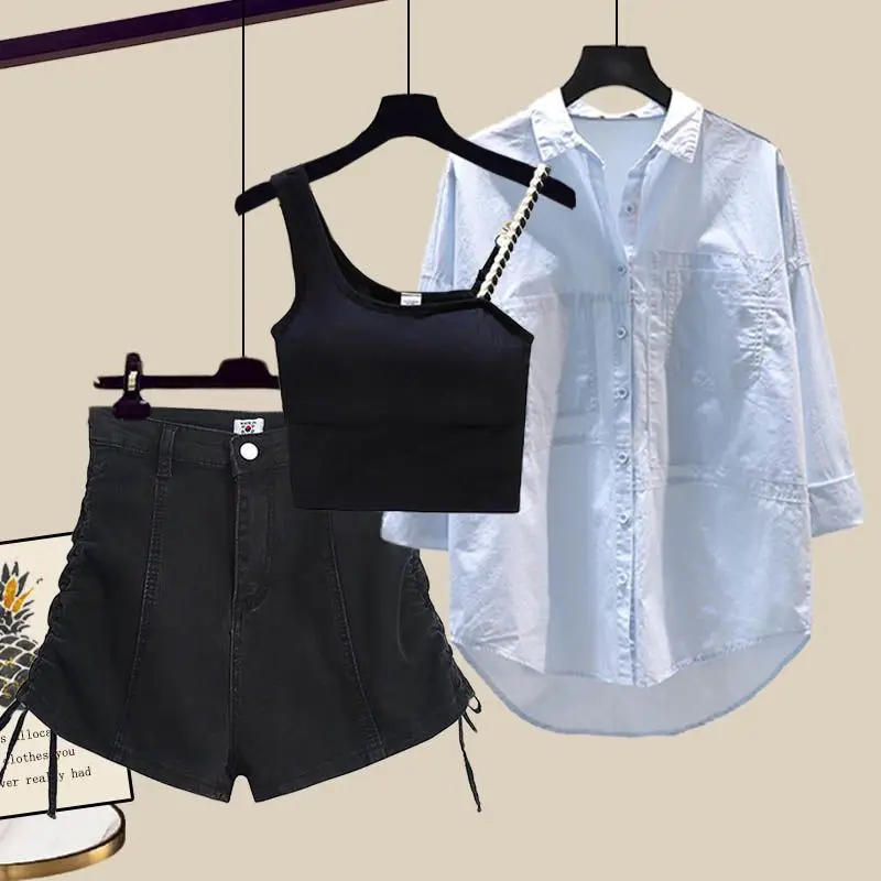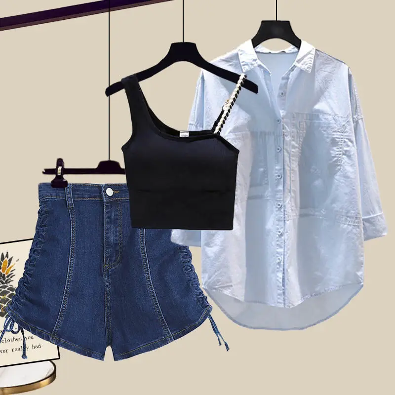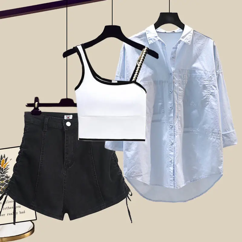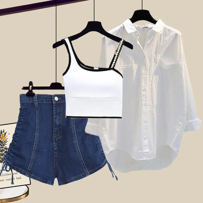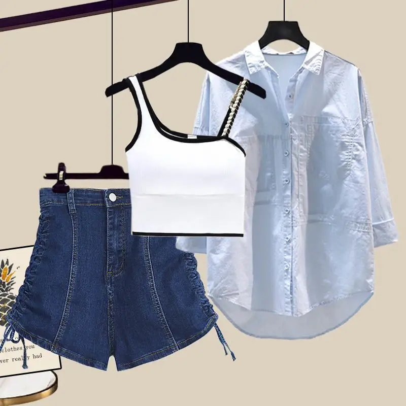 Spring and Summer Suit Women's 2023 New Korean Version Sunscreen Shirt Suspender Vest Denim Shorts Three-piece Set