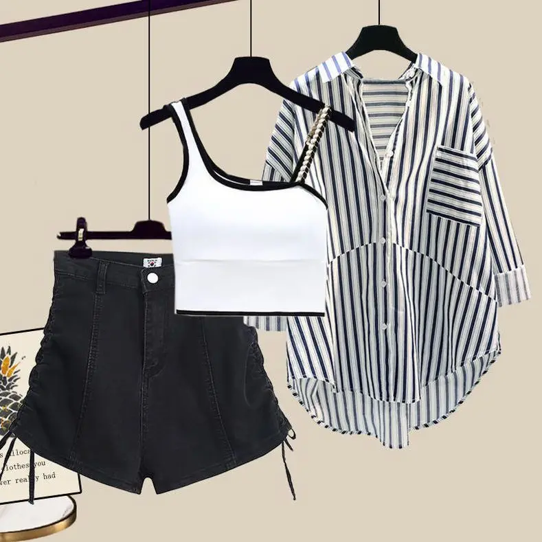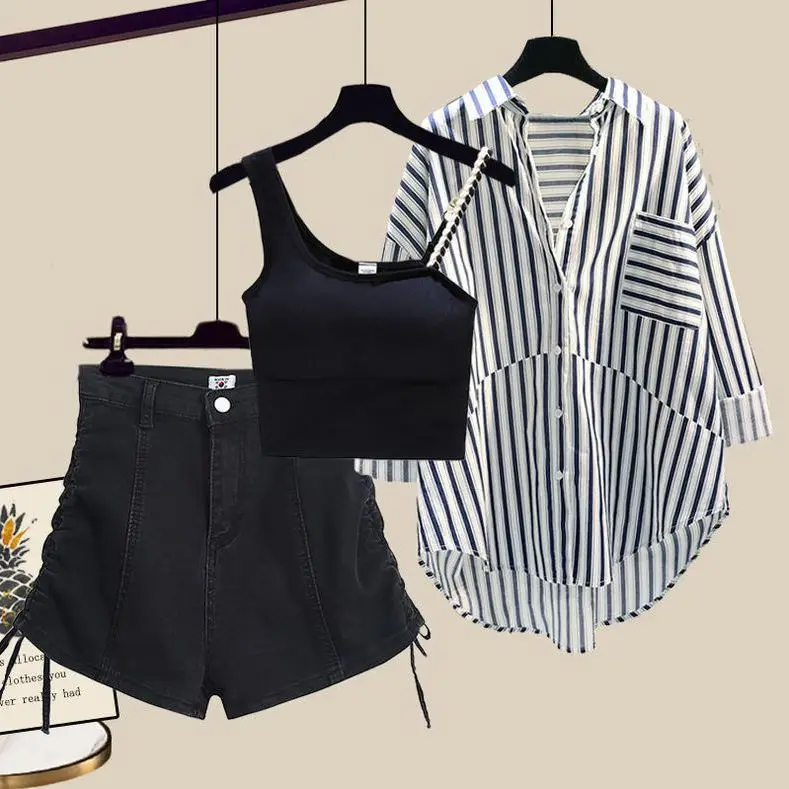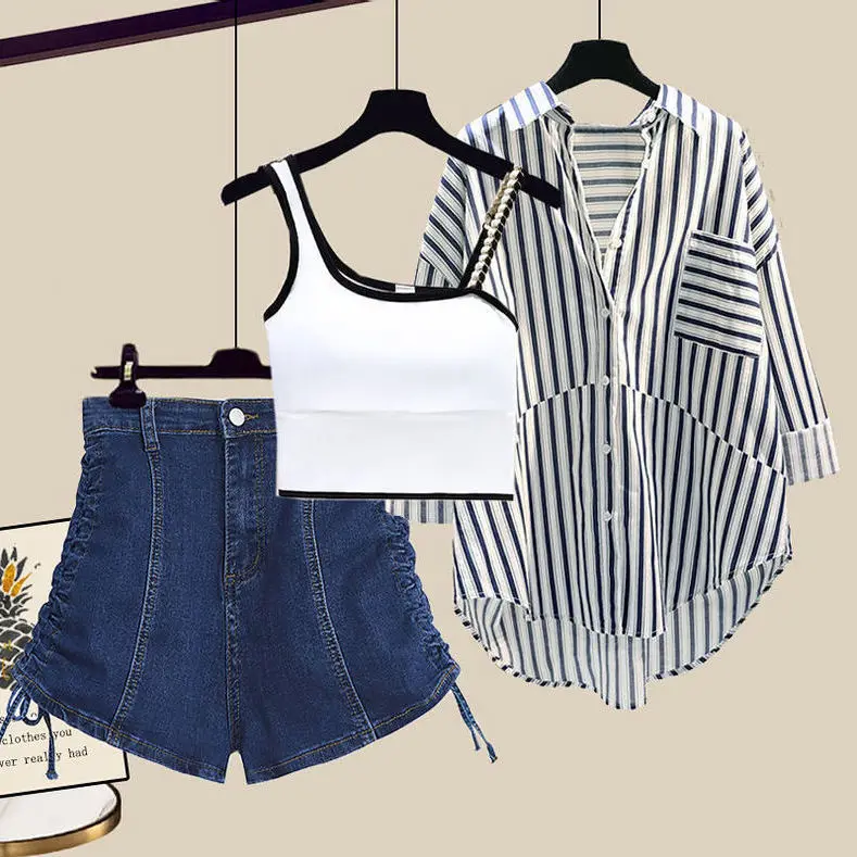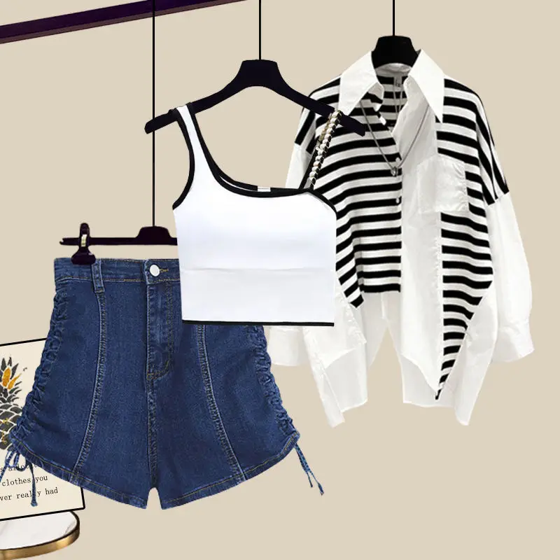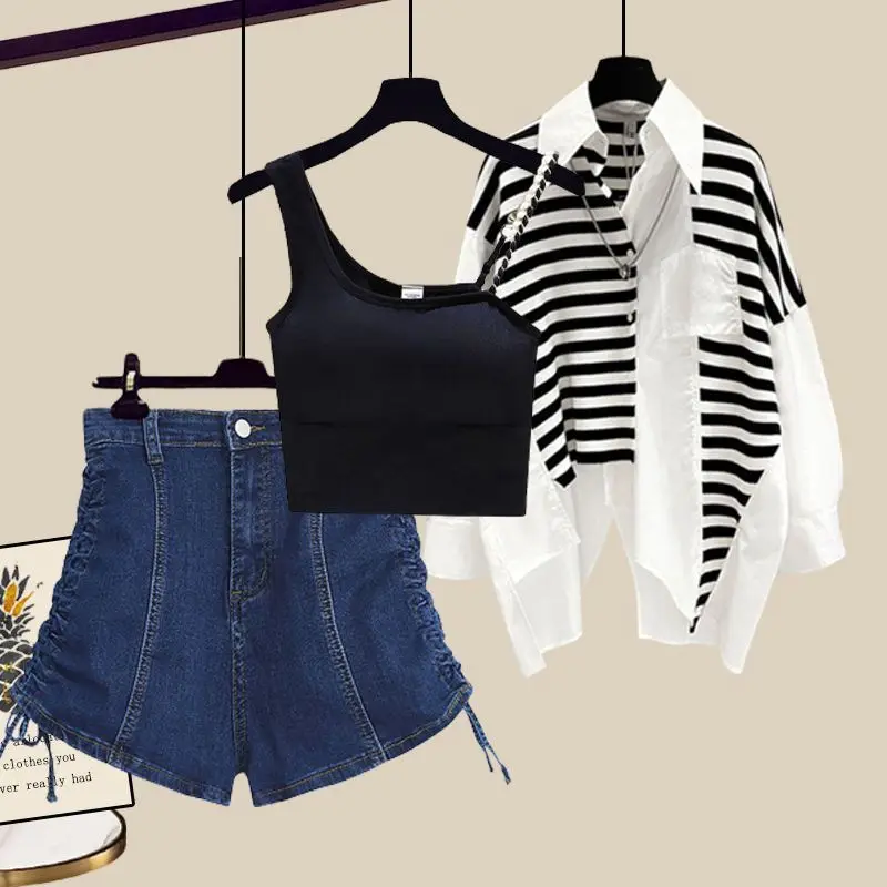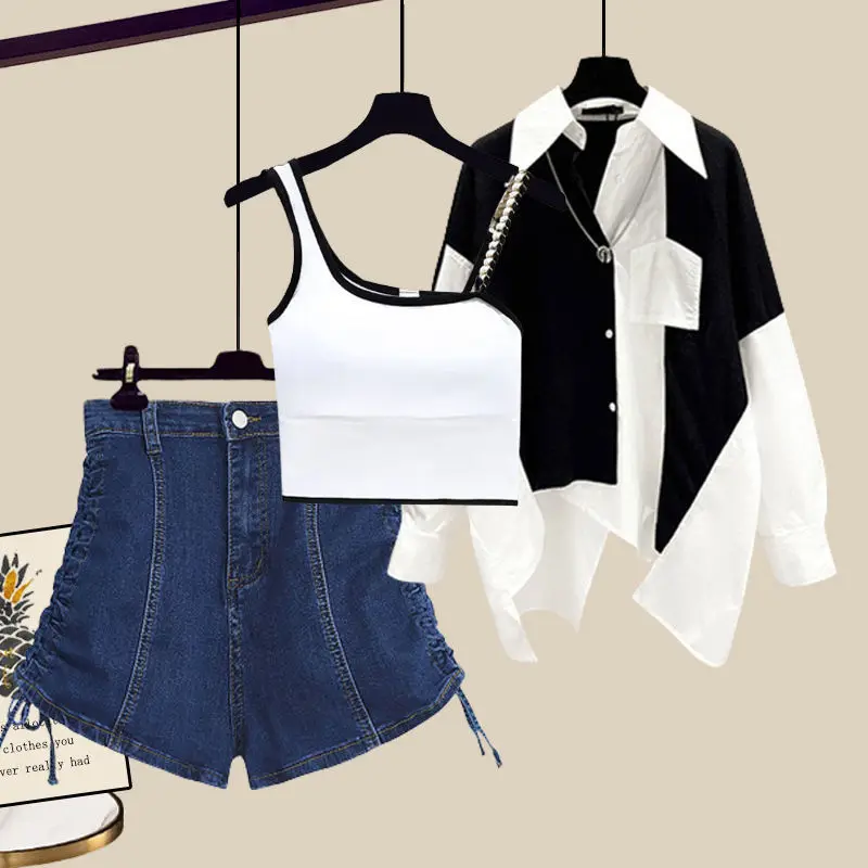 Spring and Summer Suit Women's 2023 New Korean Version Sunscreen Shirt Suspender Vest Denim Shorts Three-piece Set