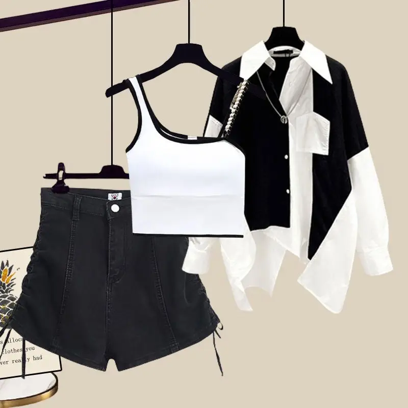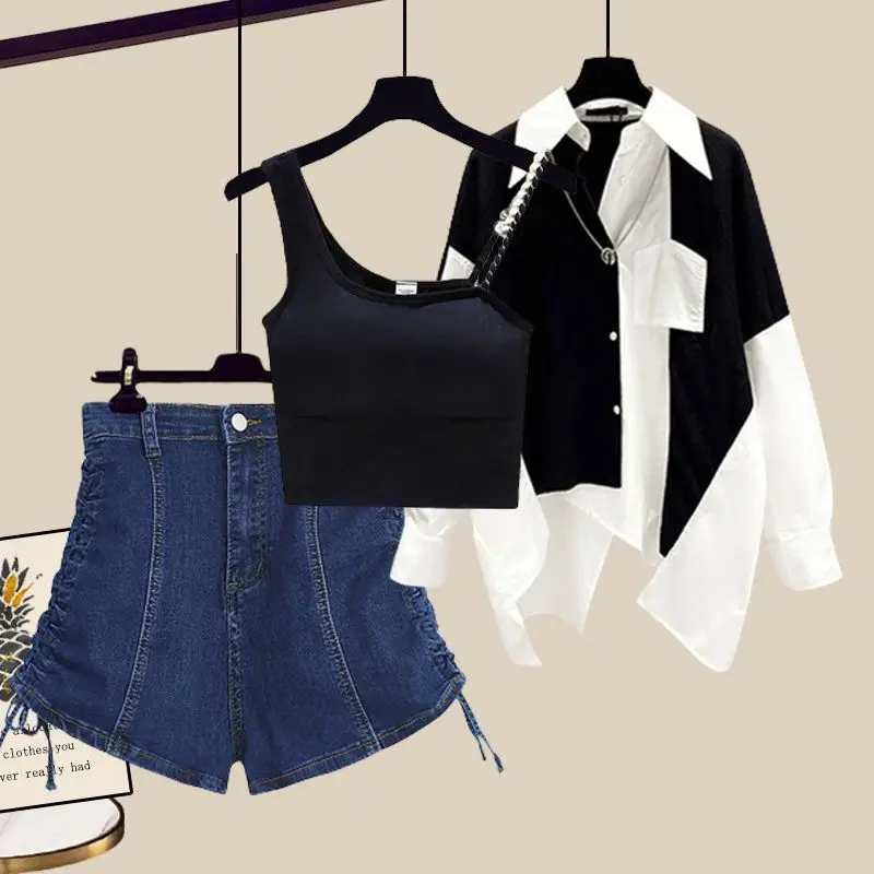 Spring and Summer Suit Women’s 2023 New Korean Version Sunscreen Shirt Suspender Vest Denim Shorts Three-piece Set