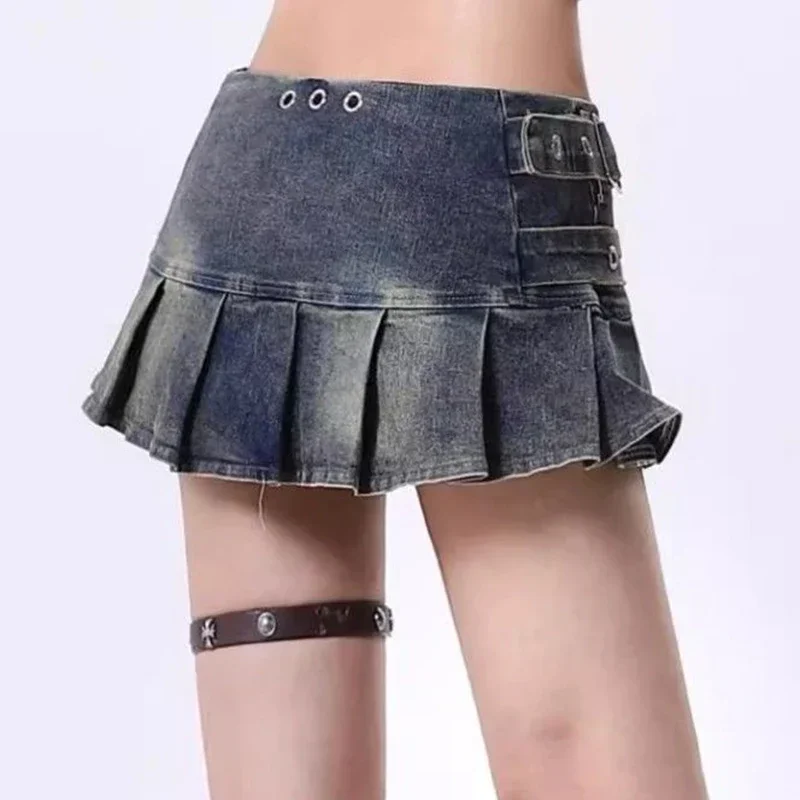 Vintage Gothic High Waist Denim Pleated Skirts Women Summer American Retro Casual Jean Mini Skirt 2025 Streetwear Female Faldas