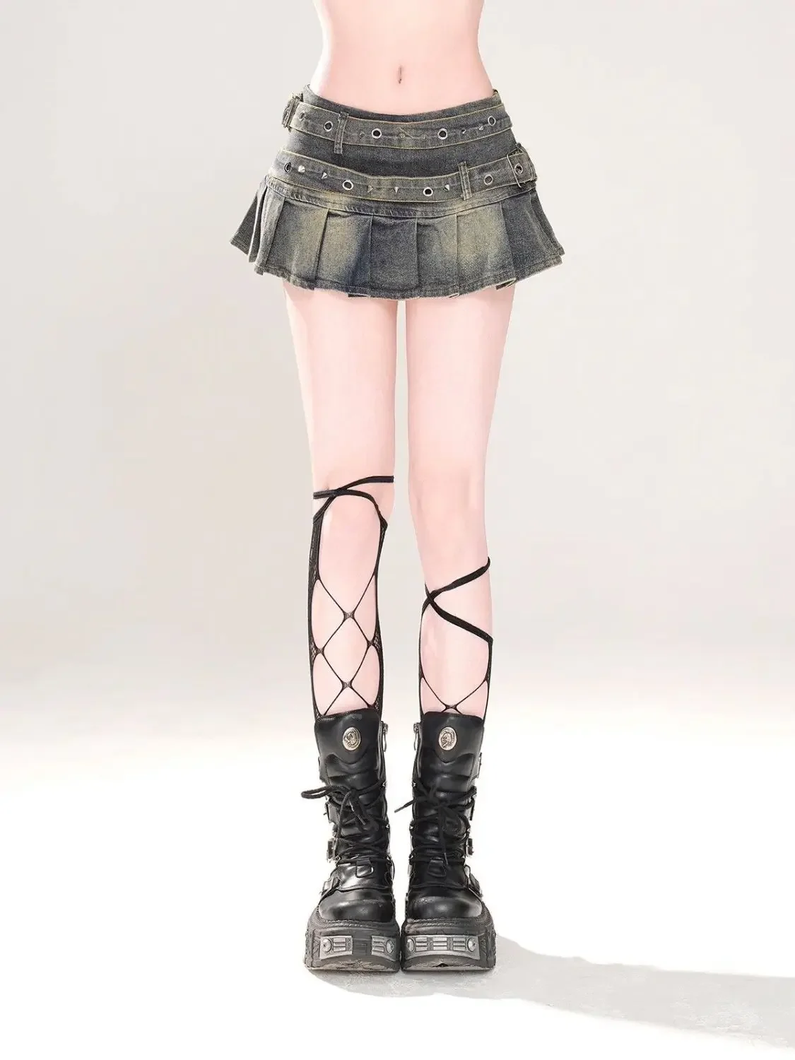 Vintage Gothic High Waist Denim Pleated Skirts Women Summer American Retro Casual Jean Mini Skirt 2025 Streetwear Female Faldas