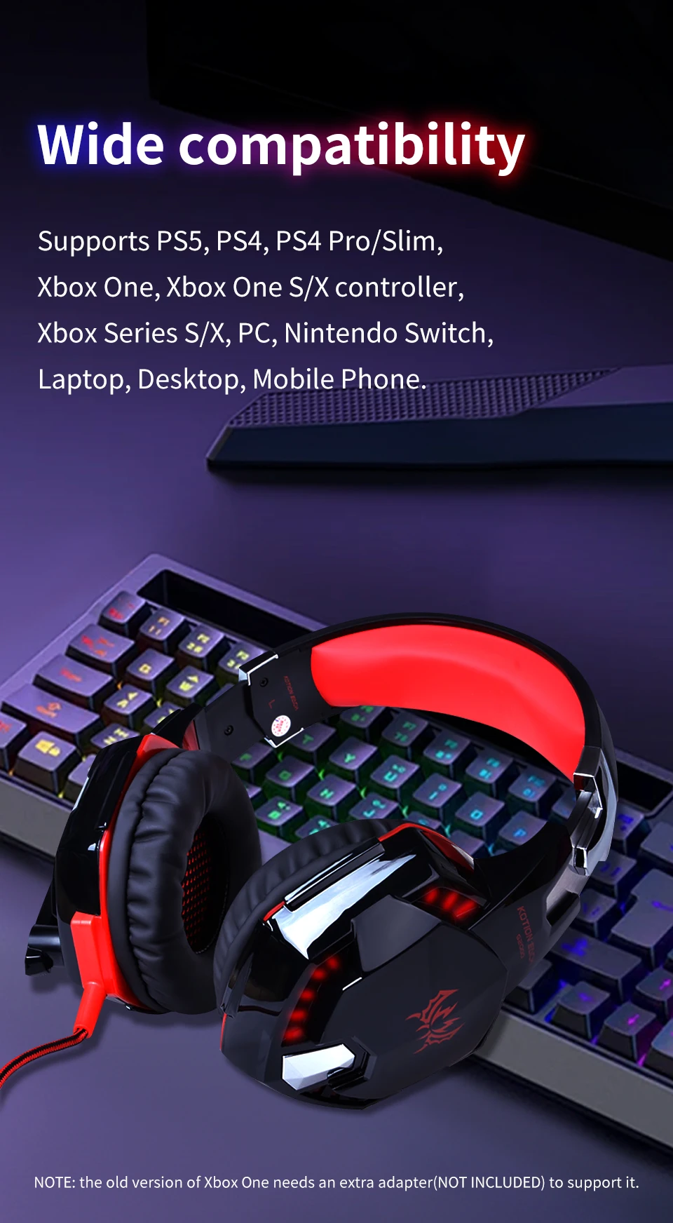 6.The headphone connector features a 3.5mm + 3.5mm + USB design, with USB responsible for headphone lighting, and the 3.5mm plugs compatible with smartphones, PCs, laptops, PS4, PS5, Xbox, and Switch controllers.
