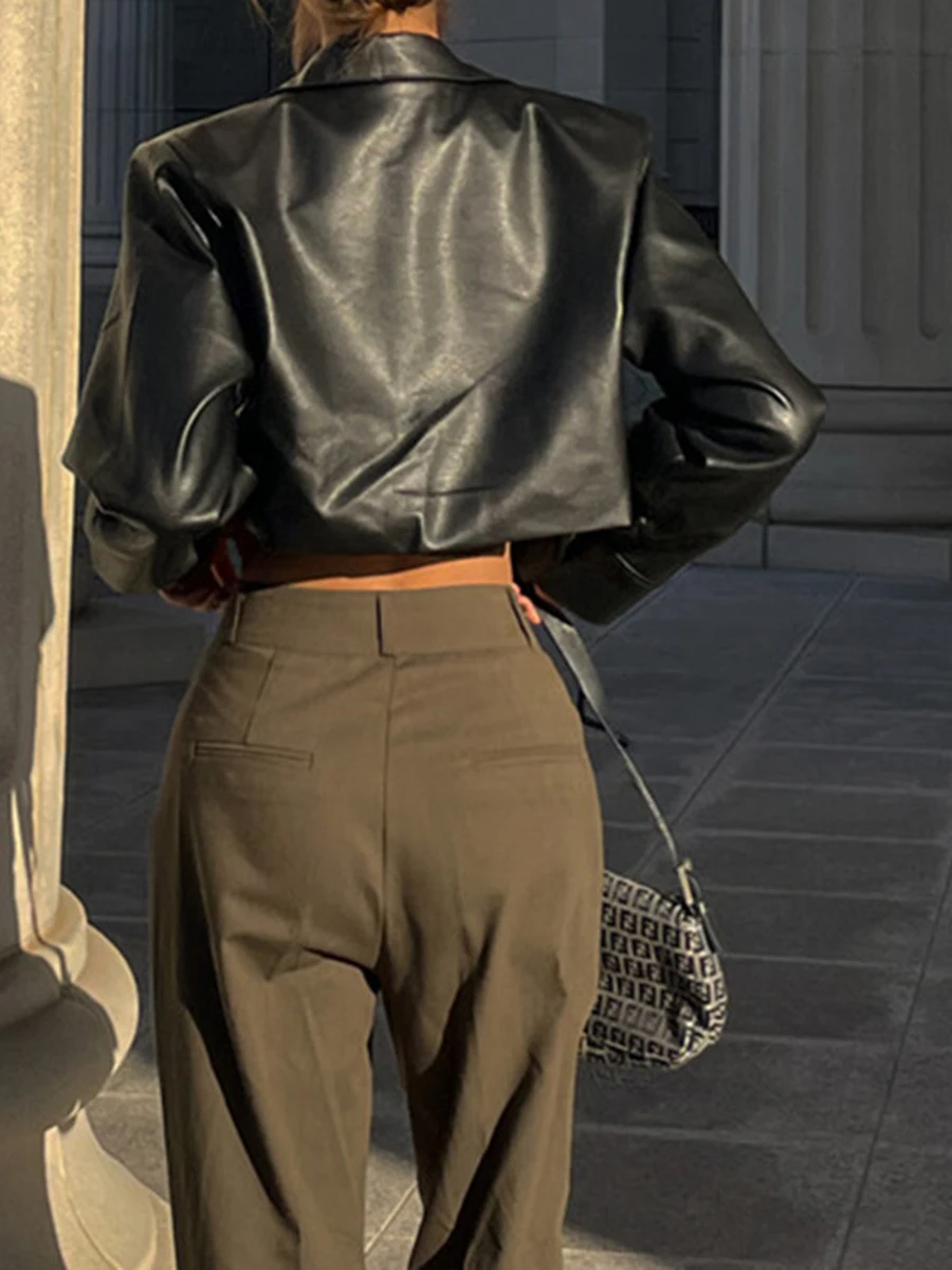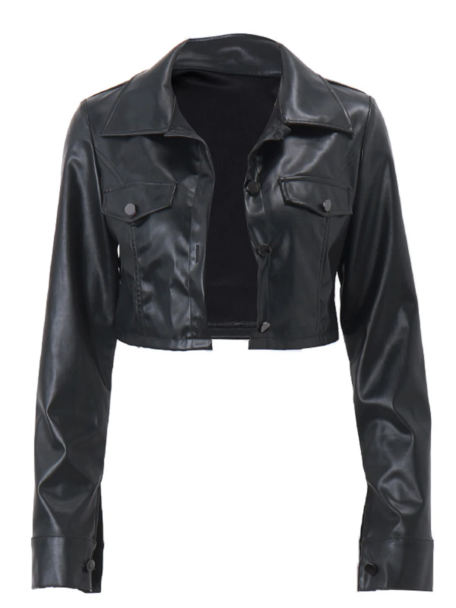 Women Crop Leather Jacket Solid Color Casual Long Sleeve Button Down Jacket Fall Outwear