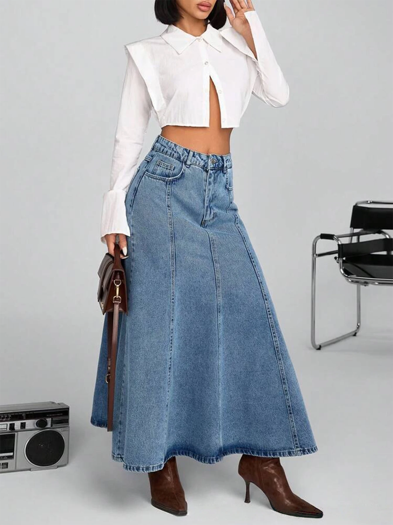 Women's denim long half skirt, with large A-shaped loose pleated design, stylish and elegant slanted pocket, nostalgic washed bl