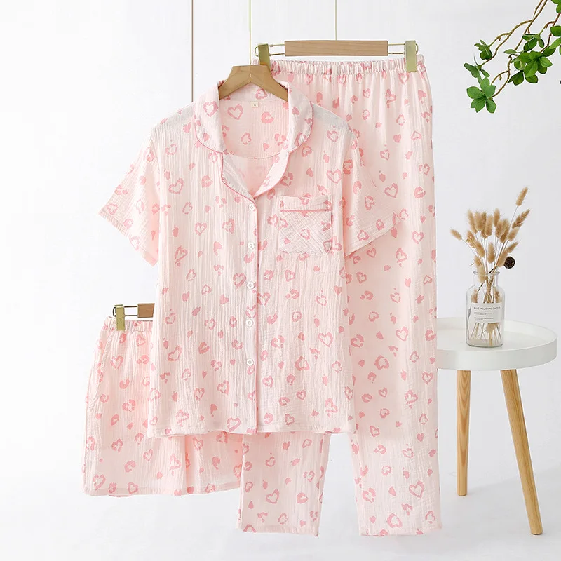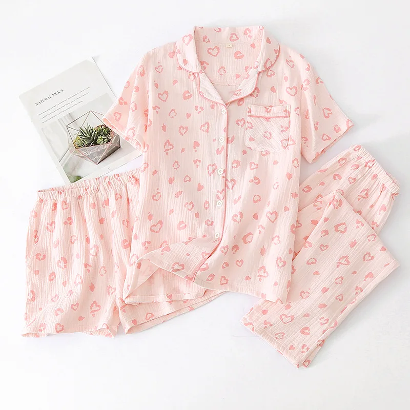Women’s Summer Pajamas 3 Pieces Set 100% Cotton Female Sleepwear Pajamas Sets Short Sleeved Long Pants and Shorts Suit Female