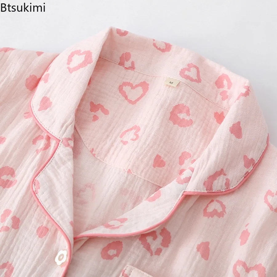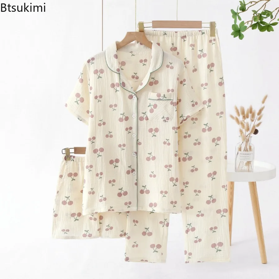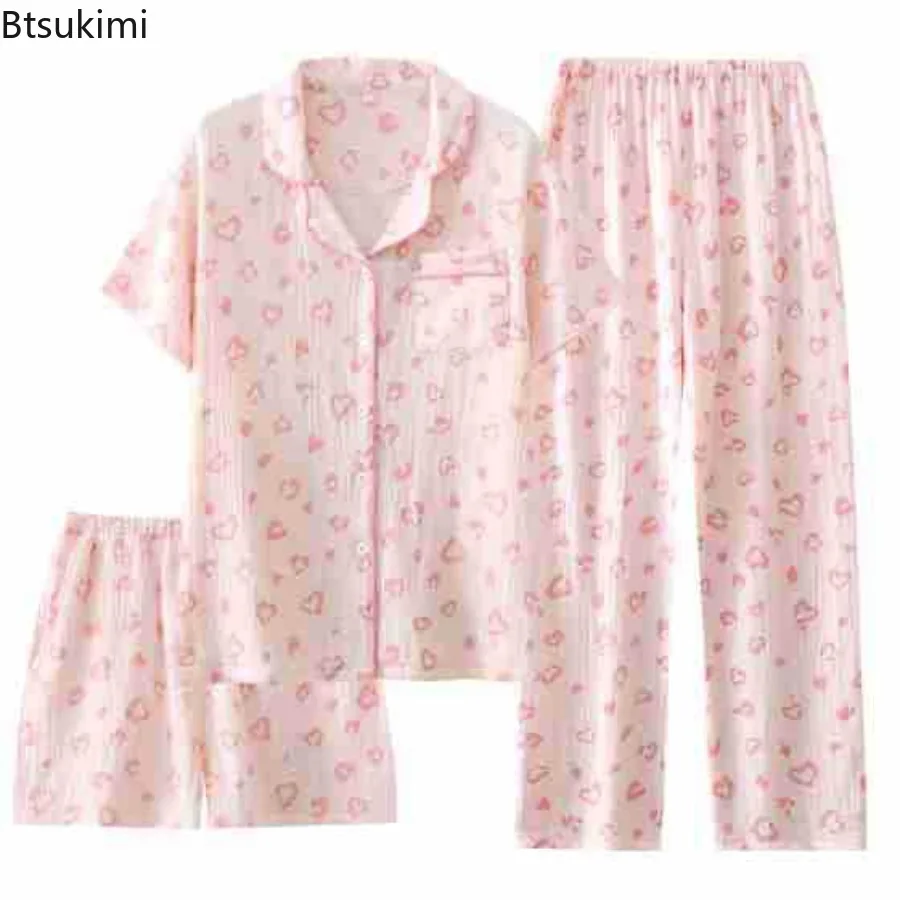 Women’s Summer Pajamas 3 Pieces Set 100% Cotton Female Sleepwear Pajamas Sets Short Sleeved Long Pants and Shorts Suit Female