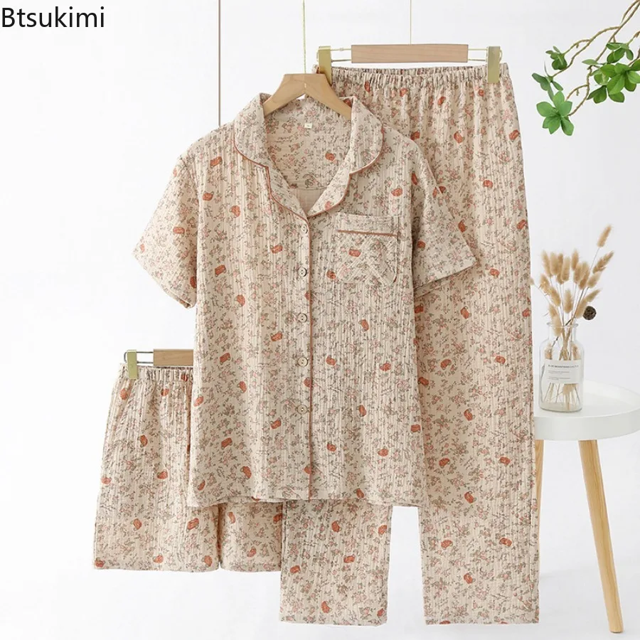 Women's Summer Pajamas 3 Pieces Set 100% Cotton Female Sleepwear Pajamas Sets Short Sleeved Long Pants and Shorts Suit Female