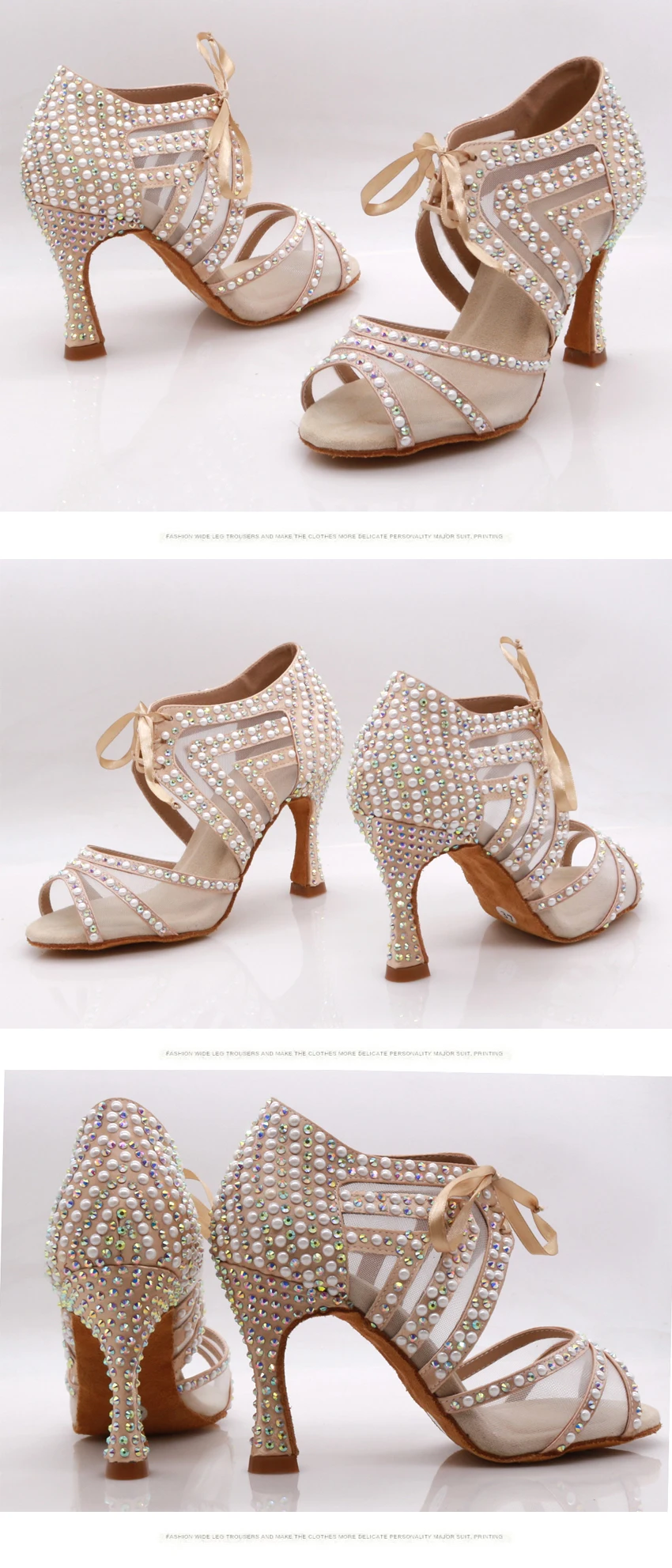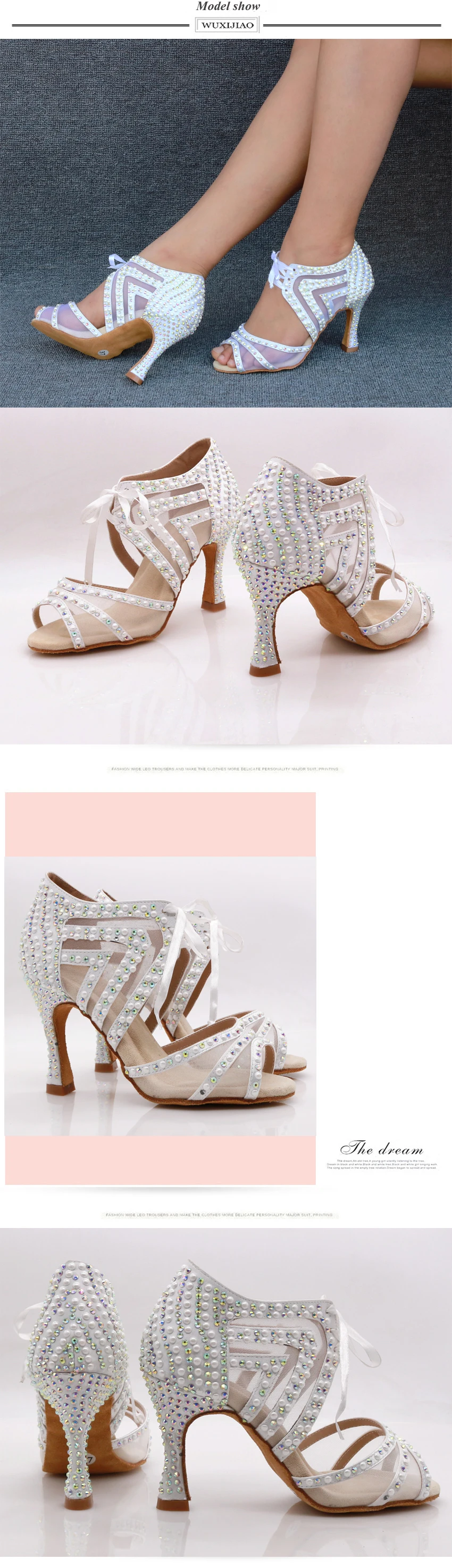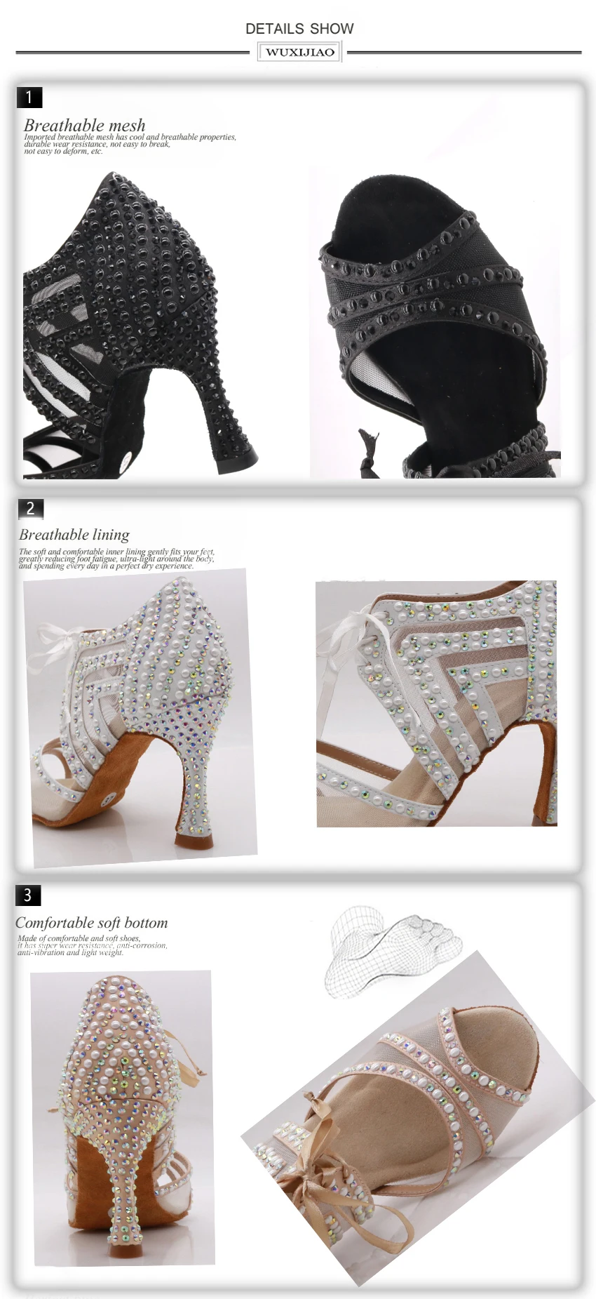 WUXIJIAO Brand Latin dance pearl decoration shoes soft bottom shoes salsa ballroom women lace high heel dance shoes Cuban heels